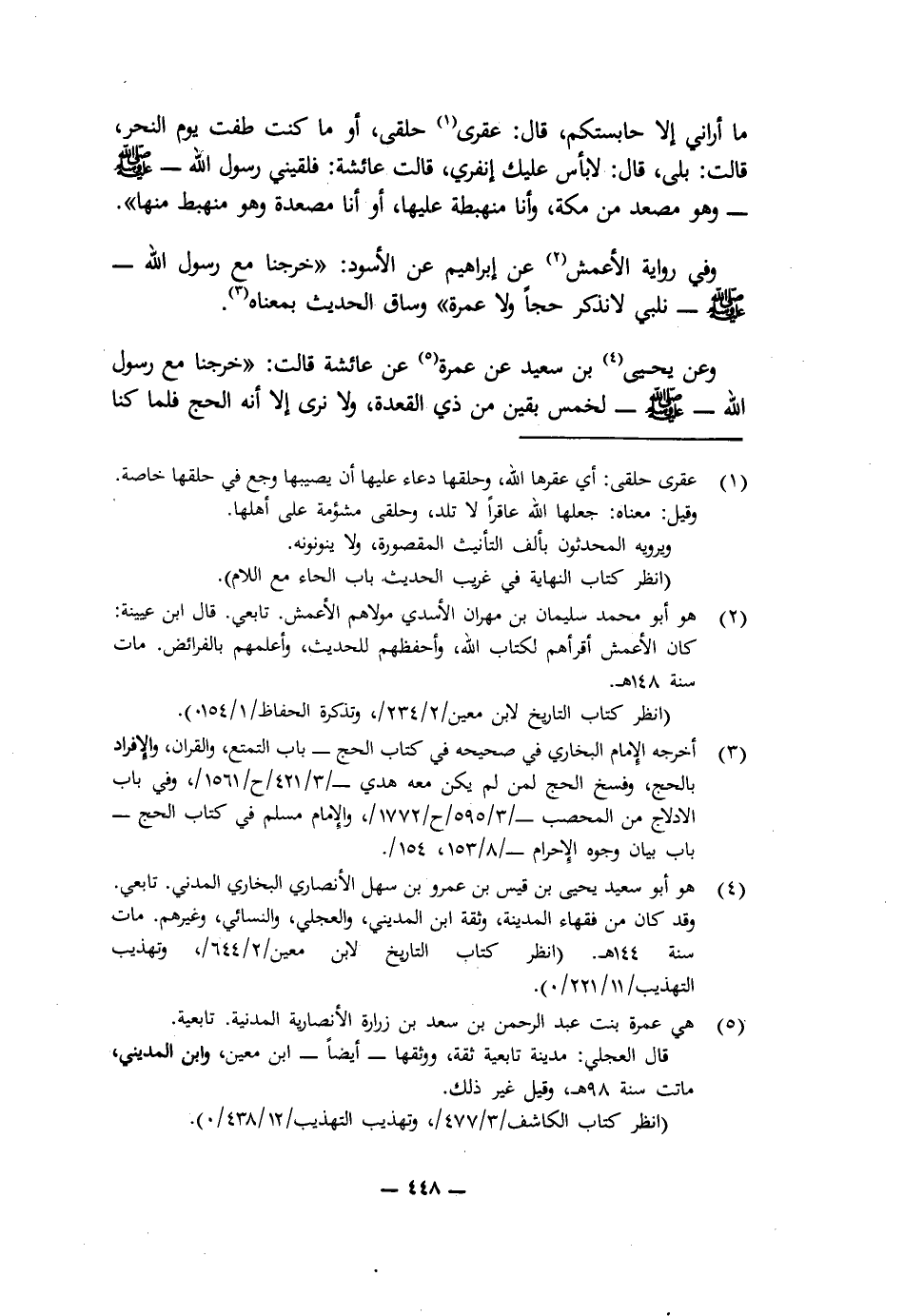 مَا أُرَانِي إِلَّا حَابِسَتَكُمْ، قَالَ: عَقْرَى حَلْقَى، أَوَمَا كُنْتِ طُفْتِ يَوْمَ النَّحْرِ، قَالَتْ: بَلَى، قَالَ: لَا بَأْسَ عَلَيْكِ انْفِرِي، قَالَتْ عَائِشَةُ: فَلَقِيَنِي رَسُولُ اللَّهِ - صَلَّى اللَّهُ عَلَيْهِ وَسَلَّمَ - وَهُوَ مُصْعِدٌ مِنْ مَكَّةَ وَأَنَا مُنْهَبِطَةٌ عَلَيْهَا، أَوْ أَنَا مُصْعِدَةٌ وَهُوَ مُنْهَبِطٌ مِنْهَا» ".