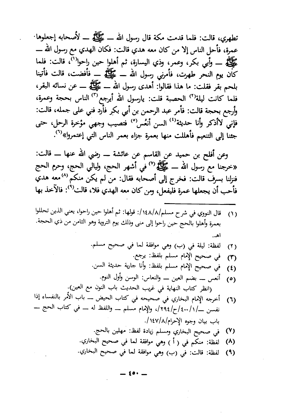 تَطْهُرِي، قَالَتْ: فَلَمَّا قَدِمْتُ مَكَّةَ قَالَ رَسُولُ اللَّهِ - صَلَّى اللَّهُ عَلَيْهِ وَسَلَّمَ - لِأَصْحَابِهِ: اجْعَلُوهَا عُمْرَةً، فَأَحَلَّ النَّاسُ إِلَّا مَنْ كَانَ مَعَهُ هَدْيٌ، قَالَتْ: فَكَانَ الْهَدْيُ مَعَ رَسُولِ اللَّهِ - صَلَّى اللَّهُ عَلَيْهِ وَسَلَّمَ - وَأَبِي بَكْرٍ وَعُمَرَ، وَذِي الْيَسَارَةِ، ثُمَّ أَهَلُّوا حِينَ رَاحُوا، قَالَتْ: فَلَمَّا كَانَ يَوْمُ النَّحْرِ طَهُرْتُ، فَأَمَرَنِي رَسُولُ اللَّهِ - صَلَّى اللَّهُ عَلَيْهِ وَسَلَّمَ - فَأَفَضْتُ، قَالَتْ: فَأُتِينَا بِلَحْمِ بَقَرٍ فَقُلْتُ: مَا هَذَا؟ فَقَالُوا: أَهْدَى رَسُولُ اللَّهِ - صَلَّى اللَّهُ عَلَيْهِ وَسَلَّمَ - عَنْ نِسَائِهِ الْبَقَرَ، فَلَمَّا كَانَتْ لَيْلَةُ الْحَصْبَةِ قُلْتُ: يَا رَسُولَ اللَّهِ، أَيَرْجِعُ النَّاسُ بِحَجَّةٍ وَعُمْرَةٍ، وَأَرْجِعُ بِحَجَّةٍ؟ قَالَتْ: فَأَمَرَ عَبْدَ الرَّحْمَنِ بْنَ أَبِي بَكْرٍ فَأَرْدَفَنِي عَلَى جَمَلِهِ، قَالَتْ: فَإِنِّي لَا أَذْكُرُ وَأَنَا حَدِيثَةُ السِّنِّ أَنْعَسُ فَتُصِيبُ وَجْهِيَ مُؤَخِّرَةُ الرَّحْلِ، حَتَّى جِئْنَا إِلَى التَّنْعِيمِ فَأَهْلَلْتُ مِنْهَا بِعُمْرَةٍ جَزَاءً بِعُمَرِ النَّاسِ الَّتِي اعْتَمَرُوا» ".