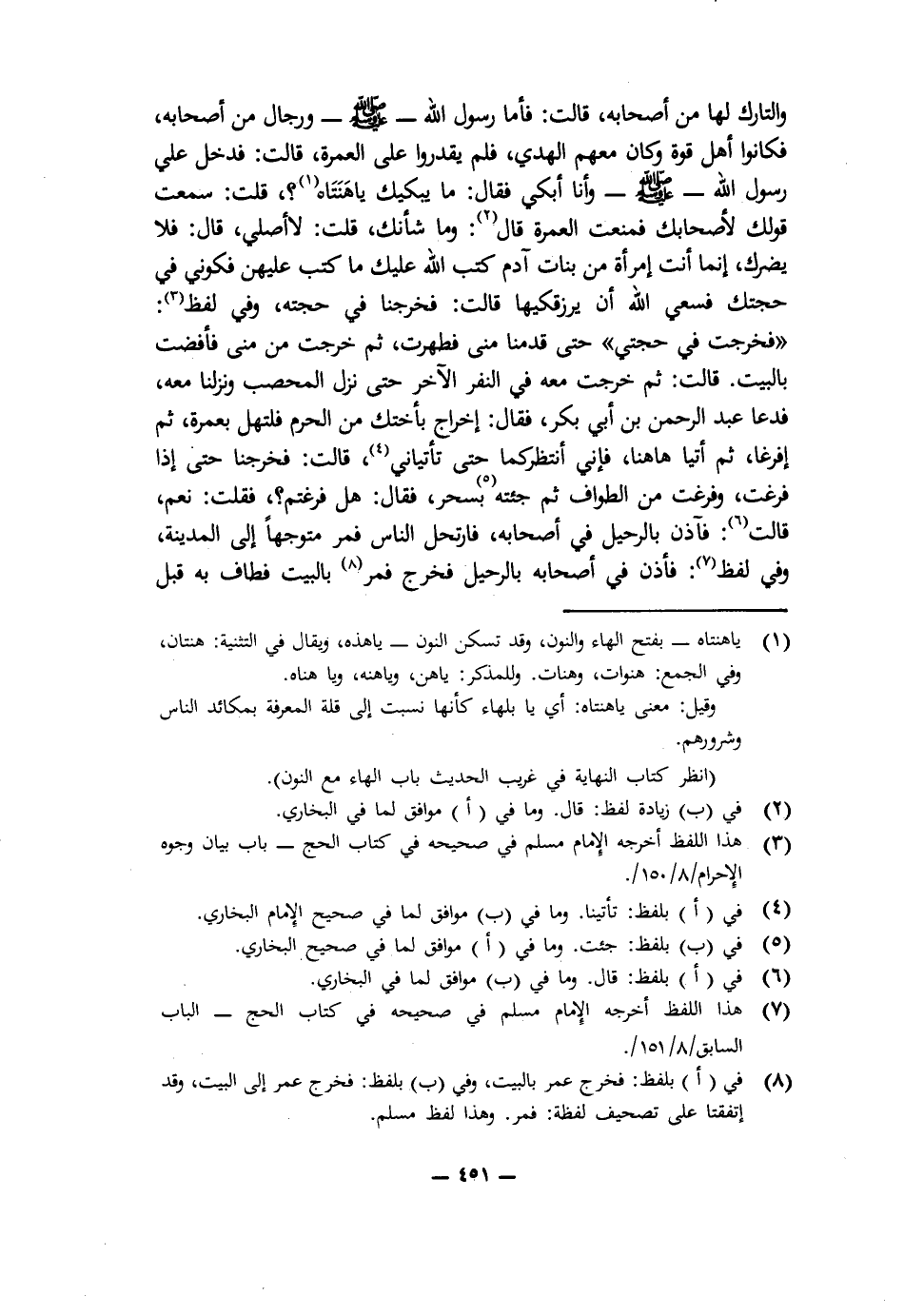 وَالتَّارِكُ لَهَا مِنْ أَصْحَابِهِ، قَالَتْ: فَأَمَّا رَسُولُ اللَّهِ - صَلَّى اللَّهُ عَلَيْهِ وَسَلَّمَ - وَرِجَالٌ مِنْ أَصْحَابِهِ، فَكَانُوا أَهْلَ قُوَّةٍ وَكَانَ مَعَهُمُ الْهَدْيُ، فَلَمْ يَقْدِرُوا عَلَى الْعُمْرَةِ، قَالَتْ: فَدَخَلَ عَلَيَّ رَسُولُ اللَّهِ - صَلَّى اللَّهُ عَلَيْهِ وَسَلَّمَ - وَأَنَا أَبْكِي، فَقَالَ: مَا يُبْكِيكَ يَا هَنْتَاهُ؟ قُلْتُ: سَمِعْتُ قَوْلَكَ لِأَصْحَابِكَ فَمُنِعْتُ الْعُمْرَةَ، قَالَ: وَمَا شَأْنُكِ؟ قُلْتُ: لَا أُصَلِّي، قَالَ: فَلَا يَضُرُّكِ، إِنَّمَا أَنْتِ امْرَأَةٌ مِنْ بَنَاتِ آدَمَ كَتَبَ اللَّهُ عَلَيْكِ مَا كَتَبَ عَلَيْهِنَّ، فَكُونِي فِي حَجَّتِكِ، فَعَسَى اللَّهُ أَنْ يَرْزُقَكِيهَا، قَالَتْ: فَخَرَجْنَا فِي حَجَّتِهِ، وَفِي لَفْظٍ: " فَخَرَجْتُ فِي حَجَّتِي " حَتَّى قَدِمْنَا مِنًى فَطَهُرْتُ، ثُمَّ خَرَجْتُ مِنْ مِنًى فَأَفَضْتُ بِالْبَيْتِ، قَالَتْ: ثُمَّ خَرَجْتُ مَعَهُ فِي النَّفَرِ الْآخَرِ حَتَّى نَزَلَ الْمُحَصَّبَ وَنَزَلْنَا مَعَهُ، فَدَعَا عَبْدَ الرَّحْمَنِ بْنَ أَبِي بَكْرٍ، فَقَالَ: اخْرُجْ بِأُخْتِكَ مِنَ الْحَرَمِ فَلْتُهِلَّ بِعُمْرَةٍ، ثُمَّ افْرُغَا، ثُمَّ ائْتِيَا هَا هُنَا، فَإِنِّي أَنْتَظِرُكُمَا حَتَّى تَأْتِيَانِي، قَالَتْ: فَخَرَجْنَا حَتَّى إِذَا فَرَغْتُ، وَفَرَغْتُ مِنَ الطَّوَافِ ثُمَّ جِئْتُهُ بِسَحَرٍ، فَقَالَ: هَلْ فَرَغْتُمْ؟ فَقُلْتُ: نَعَمْ، قَالَتْ: فَآذَنَ بِالرَّحِيلِ فِي أَصْحَابِهِ، فَارْتَحَلَ النَّاسُ فَمَرَّ مُتَوَجِّهًا إِلَى الْمَدِينَةِ، وَفِي لَفْظٍ: " فَأَذَّنَ فِي أَصْحَابِهِ بِالرَّحِيلِ، فَخَرَجَ فَمَرَّ بِالْبَيْتِ، فَطَافَ بِهِ قَبْلَ