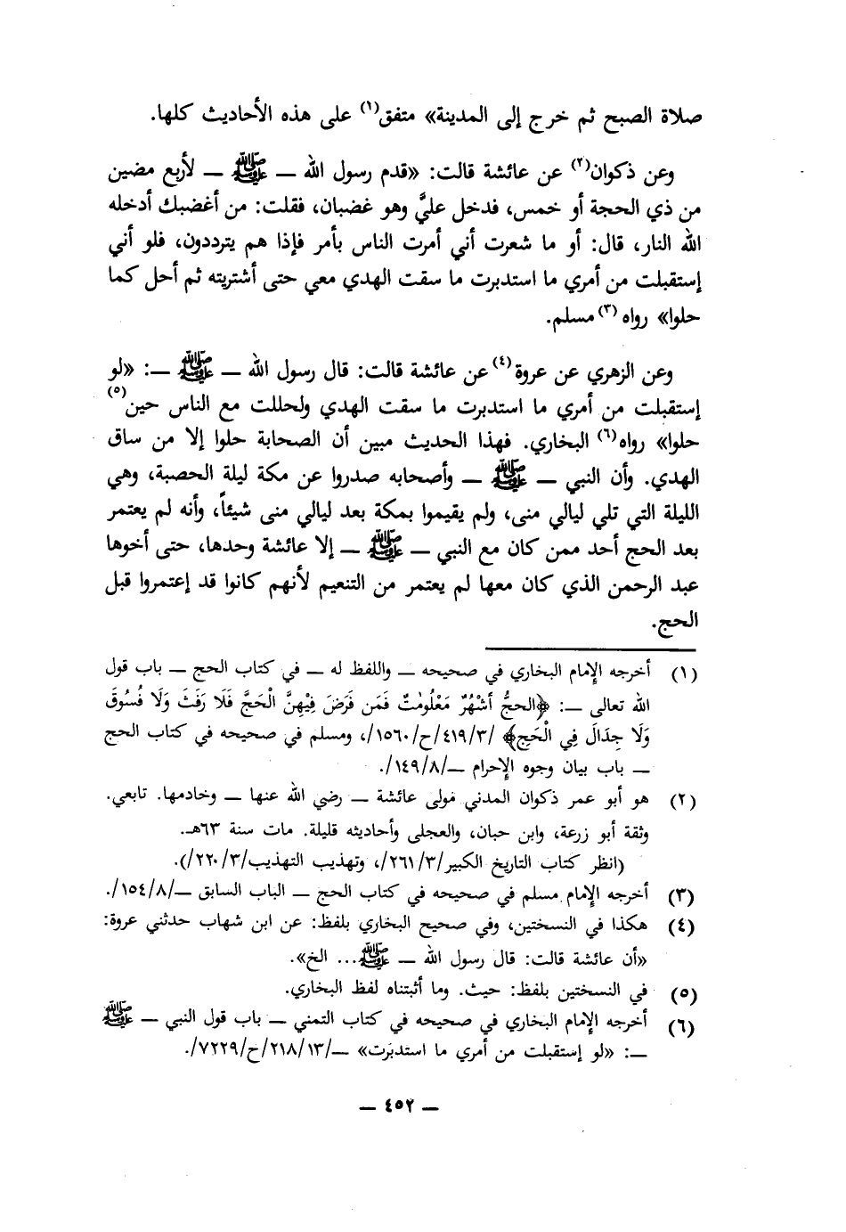 وَعَنِ الزُّهْرِيِّ، عَنْ عُرْوَةَ، عَنْ عَائِشَةَ قَالَتْ: قَالَ رَسُولُ اللَّهِ - صَلَّى اللَّهُ عَلَيْهِ وَسَلَّمَ -: " «لَوِ اسْتَقْبَلْتُ مِنْ أَمْرِي مَا اسْتَدْبَرْتُ مَا سُقْتُ الْهَدْيَ، وَلَحَلَلْتُ مَعَ النَّاسِ حِينَ حَلُّوا» " رَوَاهُ الْبُخَارِيُّ. فَهَذَا الْحَدِيثُ مُبِيِّنٌ أَنَّ الصَّحَابَةَ حَلُّوا إِلَّا مَنْ سَاقَ الْهَدْيَ. وَأَنَّ النَّبِيَّ - صَلَّى اللَّهُ عَلَيْهِ وَسَلَّمَ - وَأَصْحَابَهُ صَدَرُوا عَنْ مَكَّةَ لَيْلَةَ الْحَصْبَةِ، وَهِيَ اللَّيْلَةُ الَّتِي تَلِي لَيَالِيَ مِنًى، وَلَمْ يُقِيمُوا بِمَكَّةَ بَعْدَ لَيَالِي مِنًى شَيْئًا، وَأَنَّهُ لَمْ يَعْتَمِرْ بَعْدَ الْحَجِّ أَحَدٌ مِمَّنْ كَانَ مَعَ النَّبِيِّ - صَلَّى اللَّهُ عَلَيْهِ وَسَلَّمَ - إِلَّا عَائِشَةُ وَحْدَهَا، حَتَّى أَخُوهَا عَبْدُ الرَّحْمَنِ الَّذِي كَانَ مَعَهَا لَمْ يَعْتَمِرْ مِنَ التَّنْعِيمِ؛ لِأَنَّهُمْ كَانُوا قَدِ اعْتَمَرُوا قَبْلَ الْحَجِّ.