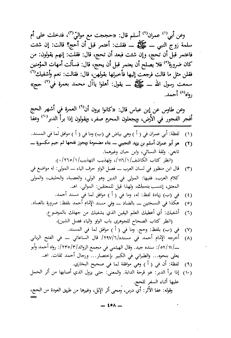 وَعَنْ أَبِي عِمْرَانَ أَسْلَمَ قَالَ: " «حَجَجْتُ مَعَ مَوَالِيَّ، فَدَخَلْتُ عَلَى أُمِّ سَلَمَةَ زَوْجِ النَّبِيِّ - صَلَّى اللَّهُ عَلَيْهِ وَسَلَّمَ - فَقُلْتُ: أَعْتَمِرُ قَبْلَ أَنْ أَحُجَّ؟ قَالَتْ: إِنْ شِئْتَ فَاعْتَمِرْ قَبْلَ أَنْ تَحُجَّ، وَإِنْ شِئْتَ فَبَعْدَ أَنْ تَحُجَّ، قَالَ: فَقُلْتُ: إِنَّهُمْ يَقُولُونَ: مَنْ كَانَ ضَرُورَةً فَلَا يَصْلُحُ أَنْ يَعْتَمِرَ قَبْلَ أَنْ يَحُجَّ، قَالَ: فَسَأَلْتُ أُمَّهَاتِ الْمُؤْمِنِينَ فَقُلْنَ مِثْلَ مَا قَالَتْ، فَرَجَعْتُ إِلَيْهَا، فَأَخْبَرْتُهَا بِقَوْلِهِنَّ، قَالَ: فَقَالَتْ: نَعَمْ وَأَشْفِيكَ، سَمِعْتُ رَسُولَ اللَّهِ - صَلَّى اللَّهُ عَلَيْهِ وَسَلَّمَ - يَقُولُ: أَهِلُّوا يَا آلَ مُحَمَّدٍ بِعُمْرَةٍ فِي حَجٍّ» " رَوَاهُ أَحْمَدُ.
