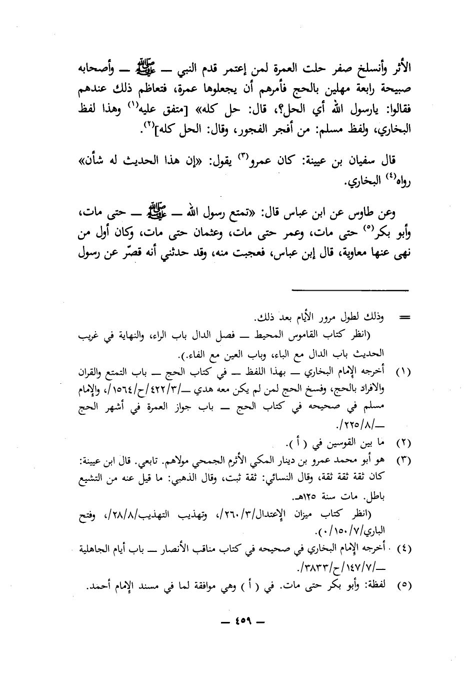 الْأَثَرُ، وَانْسَلَخَ صَفَرُ، حَلَّتِ الْعُمْرَةُ لِمَنِ اعْتَمَرَ، قَدِمَ النَّبِيُّ - صَلَّى اللَّهُ عَلَيْهِ وَسَلَّمَ - وَأَصْحَابُهُ صَبِيحَةَ رَابِعَةٍ مُهِلِّينَ بِالْحَجِّ، فَأَمَرَهُمْ أَنْ يَجْعَلُوهَا عُمْرَةً، فَتَعَاظَمَ ذَلِكَ عِنْدَهُمْ، فَقَالُوا: يَا رَسُولَ اللَّهِ، أَيٌّ الْحِلِّ؟، قَالَ: حِلٌّ كُلُّهُ» " [مُتَّفَقٌ عَلَيْهِ، وَهَذَا لَفْظُ الْبُخَارِيِّ، وَلَفْظُ مُسْلِمٍ: مِنْ أَفْجَرِ الْفُجُورِ، وَقَالَ: الْحِلُّ كُلُّهُ].