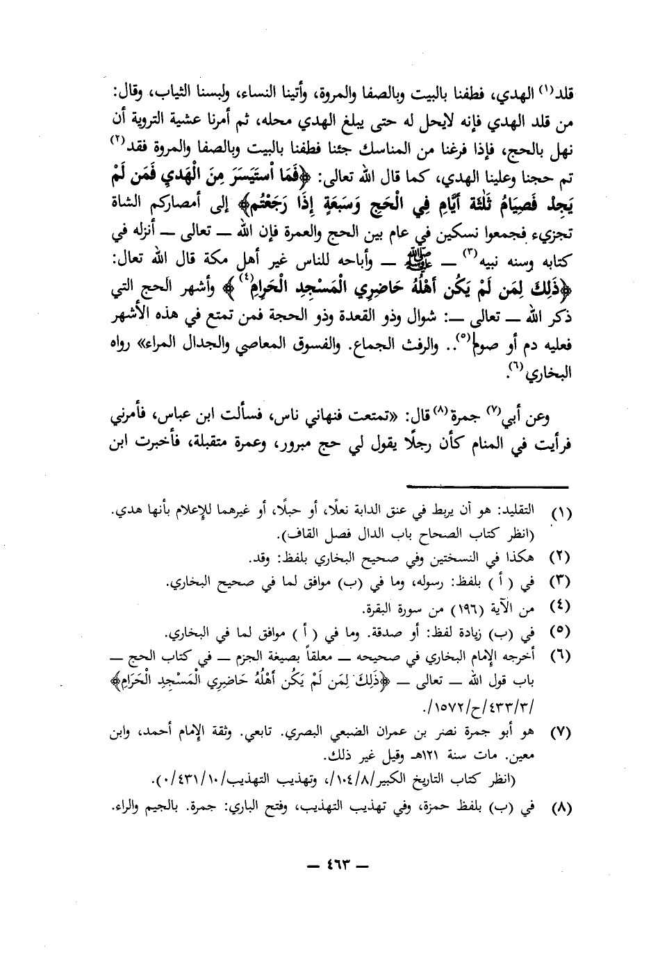 قَلَّدَ الْهَدْيَ، فَطُفْنَا بِالْبَيْتِ وَبِالصَّفَا وَالْمَرْوَةِ، وَأَتَيْنَا النِّسَاءَ، وَلَبِسْنَا الثِّيَابَ، وَقَالَ: مَنْ قَلَّدَ الْهَدْيَ فَإِنَّهُ لَا يَحِلُّ لَهُ حَتَّى يَبْلُغَ الْهَدْيُ مَحِلَّهُ، ثُمَّ أَمَرَنَا عَشِيَّةَ التَّرْوِيَةِ أَنْ نُهِلَّ بِالْحَجِّ، فَإِذَا فَرَغْنَا مِنَ الْمَنَاسِكِ جِئْنَا فَطُفْنَا بِالْبَيْتِ وَبِالصَّفَا وَالْمَرْوَةِ فَقَدْ تَمَّ حَجُّنَا وَعَلَيْنَا الْهَدْيُ، كَمَا قَالَ اللَّهُ تَعَالَى: " {فَمَا اسْتَيْسَرَ مِنَ الْهَدْيِ فَمَنْ لَمْ يَجِدْ فَصِيَامُ ثَلَاثَةِ أَيَّامٍ فِي الْحَجِّ وَسَبْعَةٍ إِذَا رَجَعْتُمْ} [البقرة: 196] " إِلَى أَمْصَارِكُمُ الشَّاةُ تُجْزِئُ، فَجَمَعُوا نُسُكَيْنِ فِي عَامٍ بَيْنَ الْحَجِّ وَالْعُمْرَةِ، فَإِنَّ اللَّهَ تَعَالَى أَنْزَلَهُ فِي كِتَابِهِ وَسُنَّةِ نَبِيِّهِ - صَلَّى اللَّهُ عَلَيْهِ وَسَلَّمَ - وَأَبَاحَهُ لِلنَّاسِ غَيْرَ أَهْلِ مَكَّةَ، قَالَ اللَّهُ تَعَالَى: " {ذَلِكَ لِمَنْ لَمْ يَكُنْ أَهْلُهُ حَاضِرِي الْمَسْجِدِ الْحَرَامِ} [البقرة: 196]» وَأَشْهُرُ الْحَجِّ الَّتِي ذَكَرَ اللَّهَ تَعَالَى: شَوَّالٌ، وَذُو الْقَعْدَةِ، وَذُو الْحِجَّةِ، فَمَنْ تَمَتَّعَ فِي هَذِهِ الْأَشْهُرِ فَعَلَيْهِ دَمٌ أَوْ صَوْمٌ. . وَالرَّفَثُ: الْجِمَاعُ، وَالْفُسُوقُ: الْمَعَاصِي، وَالْجِدَالُ: الْمِرَاءُ " رَوَاهُ الْبُخَارِيُّ.