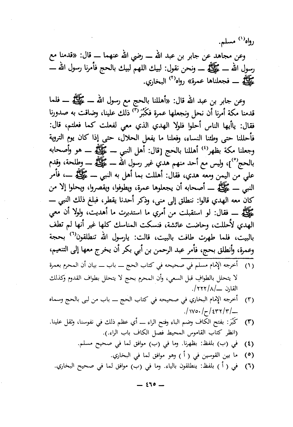 وَعَنْ مُجَاهِدٍ عَنْ جَابِرِ بْنِ عَبْدِ اللَّهِ - رَضِيَ اللَّهُ عَنْهُمَا - قَالَ: " «قَدِمْنَا مَعَ رَسُولِ اللَّهِ - صَلَّى اللَّهُ عَلَيْهِ وَسَلَّمَ - وَنَحْنُ نَقُولُ: لَبَّيْكَ اللَّهُمَّ لَبَّيْكَ بِالْحَجِّ، فَأَمَرَنَا رَسُولُ اللَّهِ - صَلَّى اللَّهُ عَلَيْهِ وَسَلَّمَ - فَجَعَلْنَاهَا عُمْرَةً» ". رَوَاهُ الْبُخَارِيُّ.