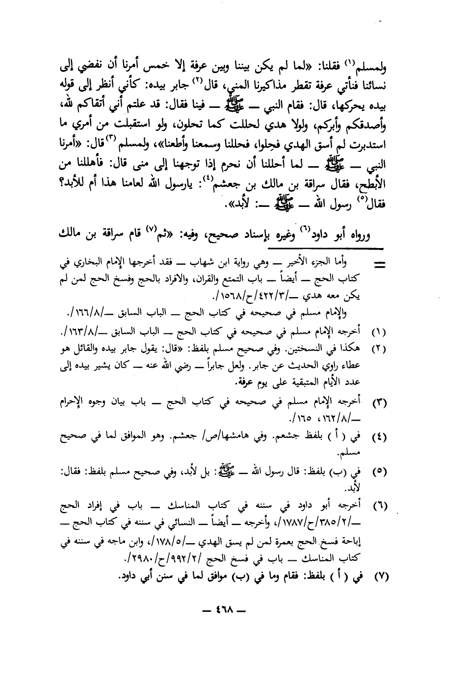 وَلِمُسْلِمٍ، فَقُلْنَا: " «لَمَّا لَمْ يَكُنْ بَيْنَنَا وَبَيْنَ عَرَفَةَ إِلَّا خَمْسٌ أَمَرَنَا أَنْ نُفْضِيَ إِلَى نِسَائِنَا، فَنَأْتِيَ عَرَفَةَ تَقْطُرُ مَذَاكِيرُنَا الْمَنِيَّ، قَالَ جَابِرٌ بِيَدِهِ: كَأَنِّي أَنْظُرُ إِلَى قَوْلِهِ بِيَدِهِ يُحَرِّكُهَا، قَالَ: فَقَامَ النَّبِيُّ - صَلَّى اللَّهُ عَلَيْهِ وَسَلَّمَ - فِينَا، فَقَالَ: قَدْ عَلِمْتُمْ أَنِّي أَتْقَاكُمْ لِلَّهِ، وَأَصْدَقُكُمْ وَأَبَرُّكُمْ، وَلَوْلَا هَدْيِي لَحَلَلْتُ كَمَا تَحِلُّونَ، وَلَوِ اسْتَقْبَلْتُ مِنْ أَمْرِي مَا اسْتَدْبَرْتُ لَمْ أَسُقِ الْهَدْيَ، فَحِلُّوا، فَحَلَلْنَا، وَسَمِعْنَا وَأَطَعْنَا» " وَلِمُسْلِمٍ قَالَ: " «أَمَرَنَا النَّبِيُّ - صَلَّى اللَّهُ عَلَيْهِ وَسَلَّمَ - لَمَّا أَحْلَلْنَا أَنْ نُحْرِمَ إِذَا تَوَجَّهْنَا إِلَى مِنًى، قَالَ: فَأَهْلَلْنَا مِنَ الْأَبْطَحِ، فَقَالَ سُرَاقَةُ بْنُ مَالِكِ بْنِ جُعْشُمٍ: يَا رَسُولَ اللَّهِ لِعَامِنَا هَذَا أَمْ لِلْأَبَدِ؟ فَقَالَ رَسُولُ اللَّهِ - صَلَّى اللَّهُ عَلَيْهِ وَسَلَّمَ -: لِأَبَدٍ» ".