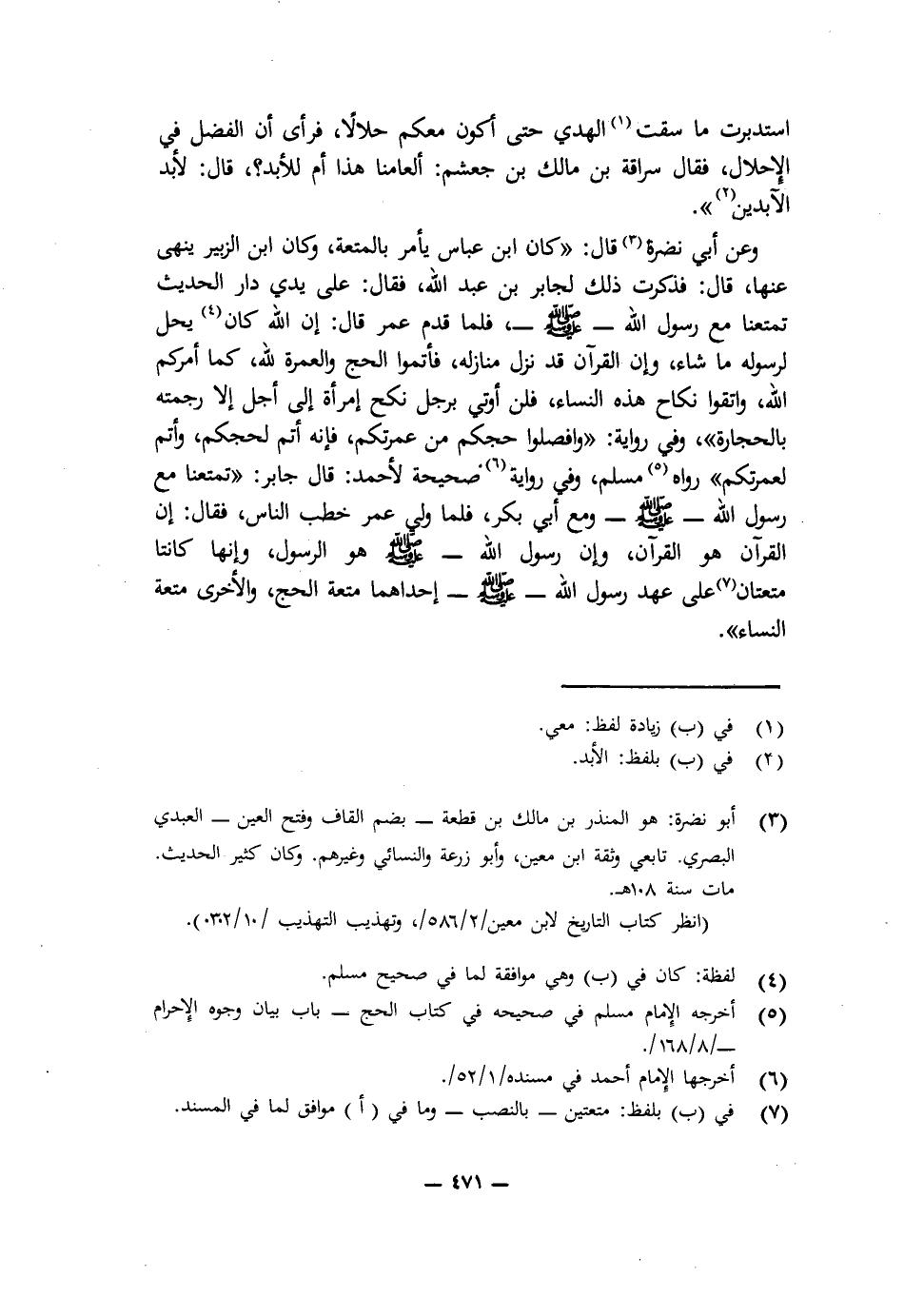 وَعَنْ أَبِي نَضْرَةَ قَالَ: " «كَانَ ابْنُ عَبَّاسٍ يَأْمُرُ بِالْمُتْعَةِ، وَكَانَ ابْنُ الزُّبَيْرِ يَنْهَى عَنْهَا، قَالَ: فَذَكَرْتُ ذَلِكَ لِجَابِرِ بْنِ عَبْدِ اللَّهِ، فَقَالَ: عَلَى يَدَيَّ دَارَ الْحَدِيثُ، تَمَتَّعْنَا مَعَ رَسُولِ اللَّهِ صَلَّى اللَّهُ عَلَيْهِ وَسَلَّمَ، فَلَمَّا قَدِمَ عُمَرُ قَالَ: إِنِ اللَّهَ كَانَ يُحِلُّ لِرَسُولِهِ مَا شَاءَ، وَإِنَّ الْقُرْآنَ قَدْ نَزَلَ مَنَازِلَهُ، فَأَتِمُّوا الْحَجَّ وَالْعُمْرَةَ لِلَّهِ، كَمَا أَمَرَكُمُ اللَّهُ، وَاتَّقُوا نِكَاحَ هَذِهِ النِّسَاءِ، فَلَنْ أُوتَى بِرَجُلٍ نَكَحَ امْرَأَةً إِلَى أَجَلٍ إِلَّا رَجَمْتُهُ بِالْحِجَارَةِ»، وَفِي رِوَايَةٍ: " «وَافْصِلُوا حَجَّكُمْ مِنْ عُمْرَتِكُمْ، فَإِنَّهُ أَتَمُّ لِحَجِّكُمْ، وَأَتَمُّ لِعُمْرَتِكُمْ» ". رَوَاهُ مُسْلِمٌ، وَفِي رِوَايَةٍ صَحِيحَةٍ لِأَحْمَدَ: قَالَ جَابِرٌ: " «تَمَتَّعْنَا مَعَ رَسُولِ اللَّهِ - صَلَّى اللَّهُ عَلَيْهِ وَسَلَّمَ - وَمَعَ أَبِي بَكْرٍ، فَلَمَّا وَلِيَ عُمَرُ خَطَبَ النَّاسَ، فَقَالَ: إِنَّ الْقُرْآنَ هُوَ الْقُرْآنُ، وَإِنَّ رَسُولَ اللَّهِ - صَلَّى اللَّهُ عَلَيْهِ وَسَلَّمَ - هُوَ الرَّسُولُ، وَإِنَّهَا كَانَتَا مُتْعَتَانِ عَلَى عَهْدِ رَسُولِ اللَّهِ - صَلَّى اللَّهُ عَلَيْهِ وَسَلَّمَ - إِحْدَاهُمَا مُتْعَةُ الْحَجِّ، وَالْأُخْرَى مُتْعَةُ النِّسَاءِ» ".