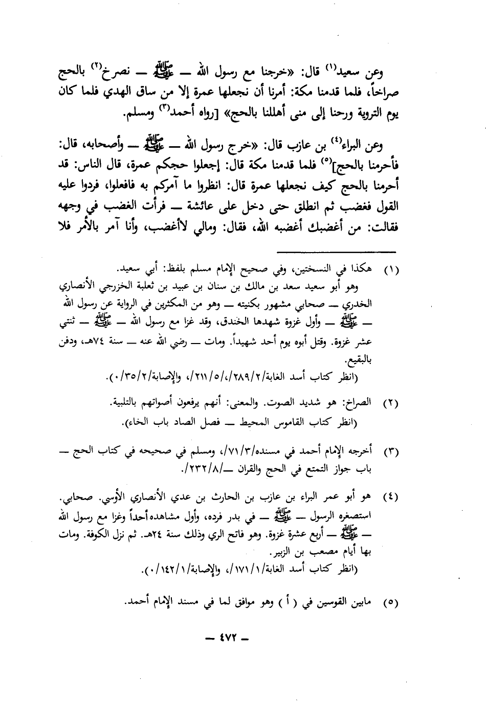 وَعَنْ سَعِيدٍ قَالَ: " «خَرَجْنَا مَعَ رَسُولِ اللَّهِ - صَلَّى اللَّهُ عَلَيْهِ وَسَلَّمَ - نَصْرُخُ بِالْحَجِّ صُرَاخًا، فَلَمَّا قَدِمْنَا مَكَّةَ أَمَرَنَا أَنْ نَجْعَلَهَا عُمْرَةً إِلَّا مَنْ سَاقَ الْهَدْيَ، فَلَمَّا كَانَ يَوْمُ التَّرْوِيَةِ وَرُحْنَا إِلَى مِنًى، أَهْلَلْنَا بِالْحَجِّ» " [رَوَاهُ أَحْمَدُ وَمُسْلِمٌ.