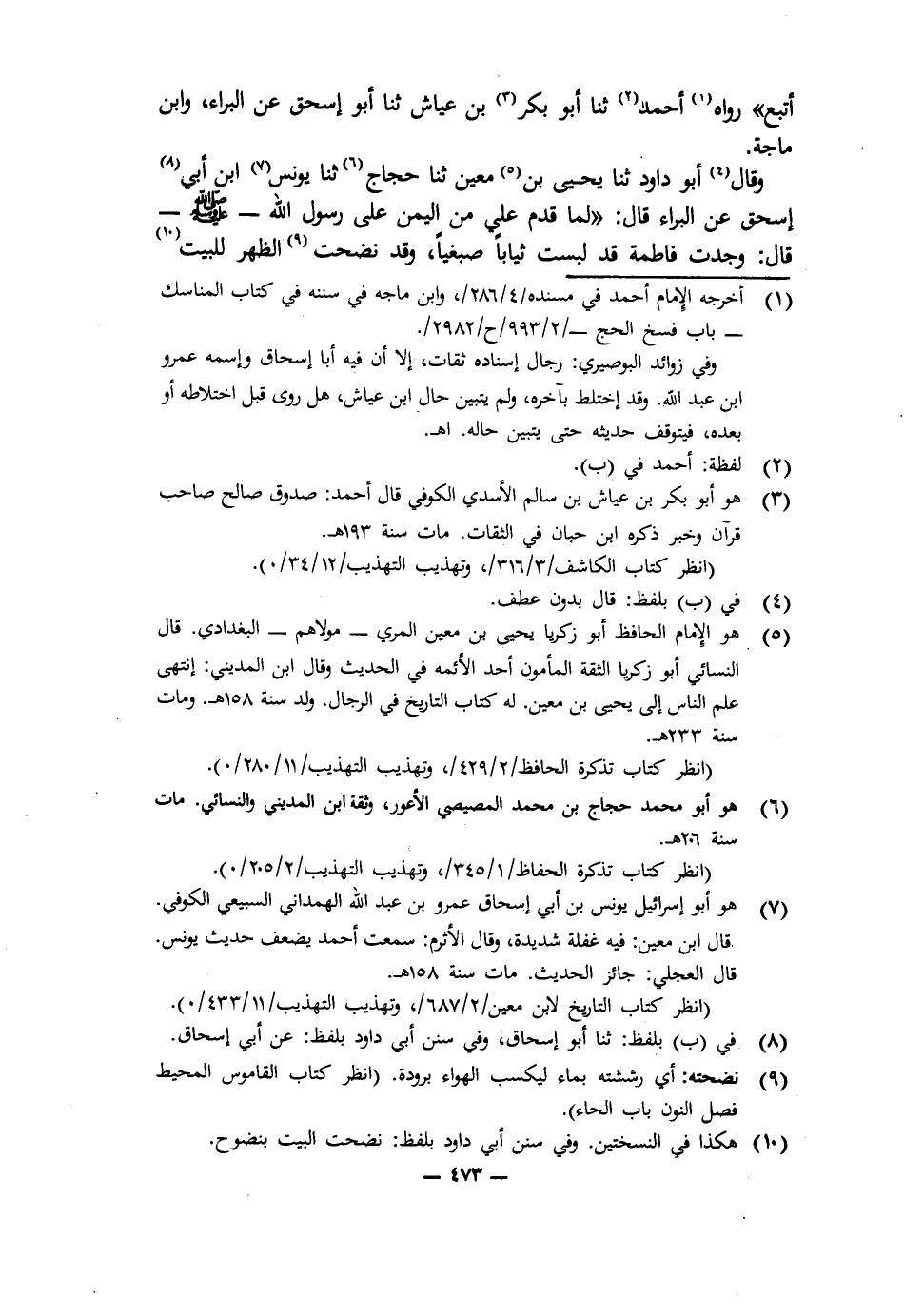 وَقَالَ أَبُو دَاوُدَ: ثَنَا يَحْيَى بْنُ مَعِينٍ، ثَنَا حَجَّاجٌ، ثَنَا يُونُسُ بْنُ أَبِي إِسْحَاقَ، عَنِ الْبَرَاءِ، قَالَ: " «لَمَّا قَدِمَ عَلِيٌّ مِنَ الْيَمَنِ عَلَى رَسُولِ اللَّهِ - صَلَّى اللَّهُ عَلَيْهِ وَسَلَّمَ - قَالَ: وَجَدْتُ فَاطِمَةَ قَدْ لَبِسَتْ ثِيَابًا صِبْغِيًّا، وَقَدْ نَضَحَتِ الظَّهْرَ لِلْبَيْتِ