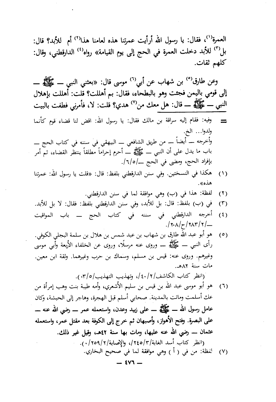 الْعُمْرَةِ، فَقَالَ: يَا رَسُولَ اللَّهِ، أَرَأَيْتَ عُمْرَتَنَا هَذِهِ لِعَامِنَا هَذَا أَمْ لِلْأَبَدِ؟ قَالَ: بَلْ لِلْأَبَدِ، دَخَلَتِ الْعُمْرَةُ فِي الْحَجِّ إِلَى يَوْمِ الْقِيَامَةِ» ". رَوَاهُ الدَّارَقُطْنِيُّ، وَقَالَ: كُلُّهُمْ ثِقَاتٌ.