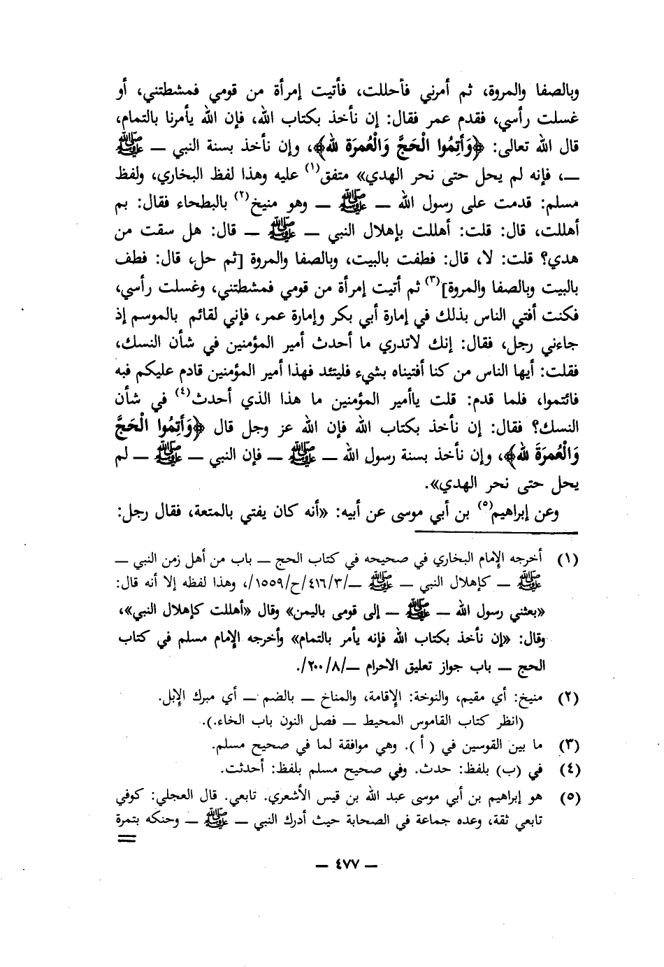 وَبِالصَّفَا وَالْمَرْوَةِ، ثُمَّ أَمَرَنِي فَأَحْلَلْتُ، فَأَتَيْتُ امْرَأَةً مِنْ قَوْمِي فَمَشَّطَتْنِي، أَوْ غَسَلَتْ رَأْسِي، فَقَدِمَ عُمَرُ فَقَالَ: إِنْ نَأْخُذْ بِكِتَابِ اللَّهِ فَإِنَّ اللَّهَ يَأْمُرُنَا بِالتَّمَامِ، قَالَ اللَّهُ تَعَالَى: " {وَأَتِمُّوا الْحَجَّ وَالْعُمْرَةَ لِلَّهِ} [البقرة: 196] "، وَإِنْ نَأْخُذْ بِسُنَّةِ النَّبِيِّ - صَلَّى اللَّهُ عَلَيْهِ وَسَلَّمَ - فَإِنَّهُ لَمْ يَحِلَّ حَتَّى نَحَرَ الْهَدْيَ» ". مُتَّفَقٌ عَلَيْهِ وَهَذَا لَفْظُ الْبُخَارِيِّ، وَلَفْظُ مُسْلِمٍ: «قَدِمْتُ عَلَى رَسُولِ اللَّهِ - صَلَّى اللَّهُ عَلَيْهِ وَسَلَّمَ - وَهُوَ مُنِيخٌ بِالْبَطْحَاءِ، فَقَالَ: بِمَ أَهْلَلْتَ؟ قَالَ: قُلْتُ: أَهْلَلْتُ بِإِهْلَالِ النَّبِيِّ - صَلَّى اللَّهُ عَلَيْهِ وَسَلَّمَ - قَالَ: هَلْ سُقْتَ مِنْ هَدْيٍ؟ قُلْتُ: لَا، قَالَ: فَطُفْ بِالْبَيْتِ وَبِالصَّفَا وَالْمَرْوَةِ، [ثُمَّ حِلَّ، قَالَ: فَطُفْتُ بِالْبَيْتِ وَبِالصَّفَا وَالْمَرْوَةِ] ثُمَّ أَتَيْتُ امْرَأَةً مِنْ قَوْمِي فَمَشَّطَتْنِي، وَغَسَلَتْ رَأْسِي، فَكُنْتُ أُفْتِي النَّاسَ بِذَلِكَ فِي إِمَارَةِ أَبِي بَكْرٍ وَإِمَارَةِ عُمَرَ، فَإِنِّي لَقَائِمٌ بِالْمَوْسِمِ إِذْ جَاءَنِي رَجُلٌ، فَقَالَ: إِنَّكَ لَا تَدْرِي مَا أَحْدَثَ أَمِيرُ الْمُؤْمِنِينَ فِي شَأْنِ النُّسُكِ، فَقُلْتُ: أَيُّهَا النَّاسُ، مَنْ كُنَّا أَفْتَيْنَاهُ بِشَيْءٍ فَلْيَتَّئِدْ، فَهَذَا أَمِيرُ الْمُؤْمِنِينَ قَادِمٌ عَلَيْكُمْ فَبِهِ فَائْتَمُّوا، فَلَمَّا قَدِمَ قُلْتُ: يَا أَمِيرَ الْمُؤْمِنِينَ، مَا هَذَا الَّذِي أُحْدِثَ فِي شَأْنِ النُّسُكِ؟ فَقَالَ: إِنْ نَأْخُذْ بِكِتَابِ اللَّهِ فَإِنَّ اللَّهَ عَزَّ وَجَلَّ قَالَ: " {وَأَتِمُّوا الْحَجَّ وَالْعُمْرَةَ لِلَّهِ} [البقرة: 196] " وَأَنْ نَأْخُذَ بِسُنَّةِ رَسُولِ اللَّهِ - صَلَّى اللَّهُ عَلَيْهِ وَسَلَّمَ - فَإِنَّ النَّبِيَّ - صَلَّى اللَّهُ عَلَيْهِ وَسَلَّمَ - لَمْ يَحِلَّ حَتَّى نَحَرَ الْهَدْيَ» ".