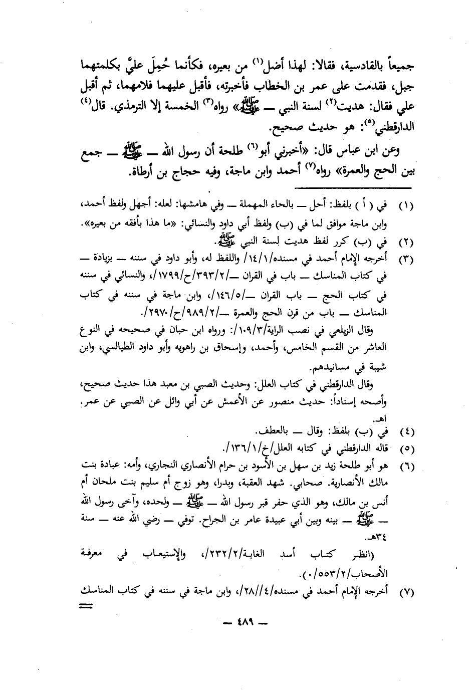 جَمِيعًا بِالْقَادِسِيَّةِ، فَقَالَا: لَهَذَا أَضَلُّ مِنْ بَعِيرِهِ، فَكَأَنَّمَا حُمِلَ عَلَيَّ بِكَلِمَتِهِمَا جَبَلٌ، فَقَدِمْتُ عَلَى عُمَرَ بْنِ الْخَطَّابِ، فَأَخْبَرْتُهُ، فَأَقْبَلَ عَلَيْهِمَا فَلَامَهُمَا، ثُمَّ أَقْبَلَ عَلَيَّ فَقَالَ: هُدِيتَ لِسُنَّةِ النَّبِيِّ - صَلَّى اللَّهُ عَلَيْهِ وَسَلَّمَ -» رَوَاهُ الْخَمْسَةُ إِلَّا التِّرْمِذِيَّ، قَالَ الدَّارَقُطْنِيُّ: هُوَ حَدِيثٌ صَحِيحٌ.