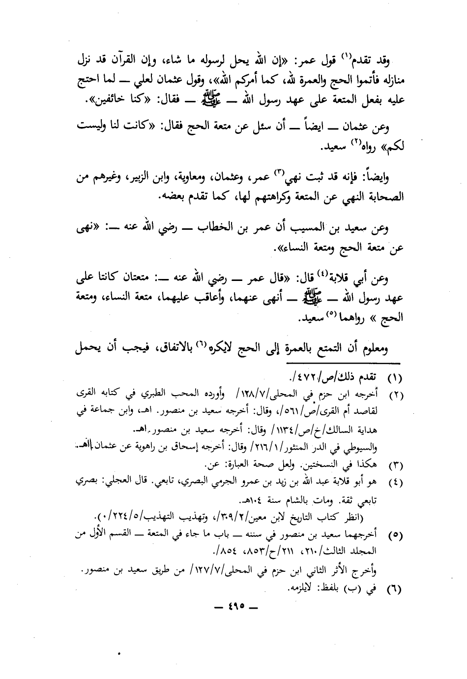 وَعَنْ أَبِي قُلَابَةَ قَالَ: " قَالَ عُمَرُ - رَضِيَ اللَّهُ عَنْهُ -: مُتْعَتَانِ كَانَتَا عَلَى عَهْدِ رَسُولِ اللَّهِ - صَلَّى اللَّهُ عَلَيْهِ وَسَلَّمَ - أَنْهَى عَنْهُمَا وَأُعَاقِبُ عَلَيْهِمَا، مُتْعَةُ النِّسَاءِ، وَمُتْعَةُ الْحَجِّ " رَوَاهُمَا سَعِيدٌ.