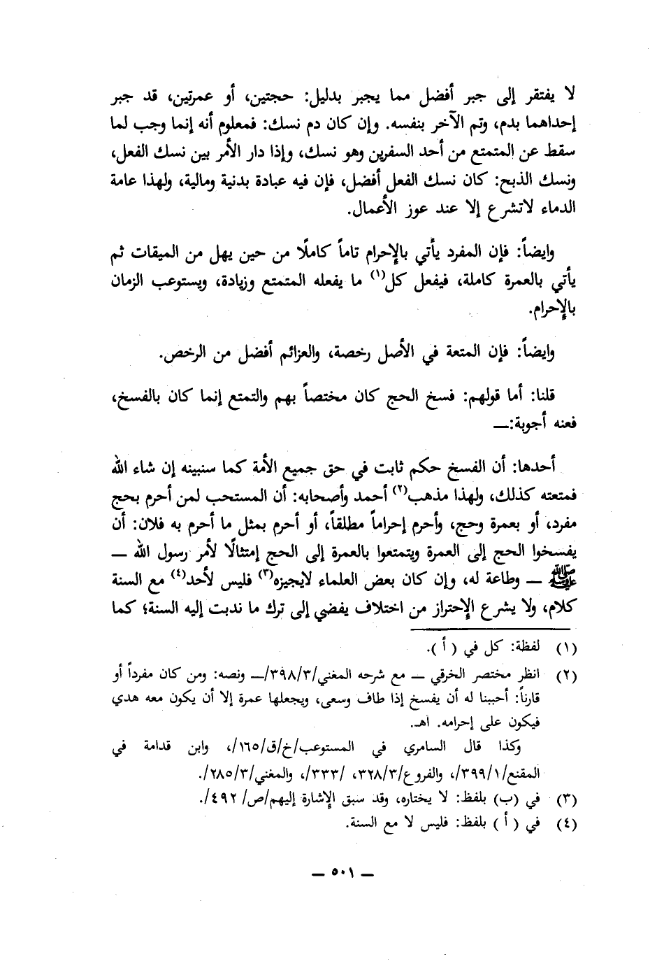أَحَدُهَا: أَنَّ الْفَسْخَ حُكْمٌ ثَابِتٌ فِي حَقِّ جَمِيعِ الْأُمَّةِ كَمَا سَنُبَيِّنُهُ إِنْ شَاءَ اللَّهُ، فَمُتْعَتُهُ كَذَلِكَ؛ وَلِهَذَا مَذْهَبُ أَحْمَدَ وَأَصْحَابِهِ: أَنَّ الْمُسْتَحَبَّ لِمَنْ أَحْرَمَ بِحَجٍّ مُفْرَدٍ، أَوْ بِعُمْرَةٍ وَحَجٍّ، وَأَحْرَمَ إِحْرَامًا مُطْلَقًا، أَوْ أَحْرَمَ بِمِثْلِ مَا أَحْرَمَ بِهِ فُلَانٌ: أَنْ يَفْسَخُوا الْحَجَّ إِلَى الْعُمْرَةِ وَيَتَمَتَّعُوا بِالْعُمْرَةِ إِلَى الْحَجِّ امْتِثَالًا لِأَمْرِ رَسُولِ اللَّهِ - صَلَّى اللَّهُ عَلَيْهِ وَسَلَّمَ - وَطَاعَةً لَهُ، وَإِنْ كَانَ بَعْضُ الْعُلَمَاءِ لَا يُجِيزُهُ فَلَيْسَ لِأَحَدٍ مَعَ السُّنَّةِ كَلَامٌ، وَلَا يُشْرَعُ الِاحْتِرَازُ مِنَ اخْتِلَافٍ يُفْضِي إِلَى تَرْكِ مَا نُدِبَتْ إِلَيْهِ السُّنَّةُ؛ كَمَا