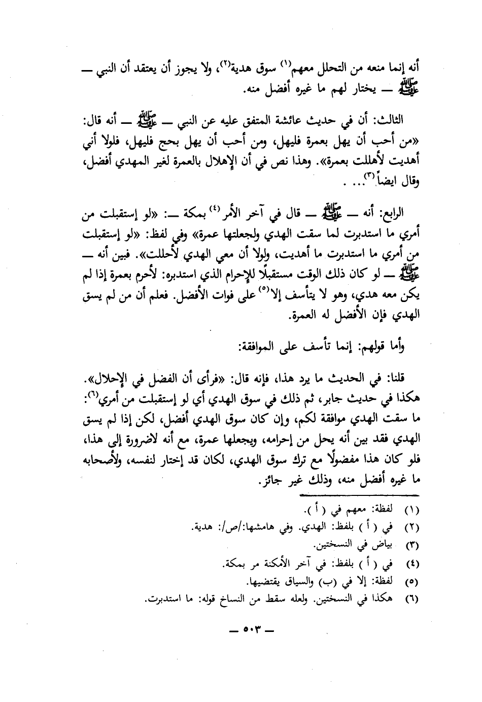 الثَّالِثُ: أَنَّ فِي حَدِيثِ عَائِشَةَ الْمُتَّفَقِ عَلَيْهِ، عَنِ النَّبِيِّ - صَلَّى اللَّهُ عَلَيْهِ وَسَلَّمَ - أَنَّهُ قَالَ: " «مَنْ أَحَبَّ أَنْ يُهِلَّ بِعُمْرَةٍ فَلْيُهِلَّ، وَمَنْ أَحَبَّ أَنْ يُهِلَّ بِحَجٍّ فَلْيُهِلَّ، فَلَوْلَا أَنِّي أَهْدَيْتُ لَأَهْلَلْتُ بِعُمْرَةٍ» ". وَهَذَا نَصٌّ فِي أَنَّ الْإِهْلَالَ بِالْعُمْرَةِ لِغَيْرِ الْمَهْدِي أَفْضَلُ، وَقَالَ أَيْضًا. . .