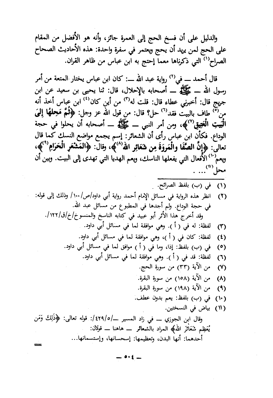 وَالدَّلِيلُ عَلَى أَنَّ فَسْخَ الْحَجِّ إِلَى الْعُمْرَةِ جَائِزٌ، وَأَنَّهُ هُوَ الْأَفْضَلُ مِنَ الْمَقَامِ عَلَى الْحَجِّ لِمَنْ يُرِيدُ أَنْ يَحُجَّ وَيَعْتَمِرَ فِي سَفْرَةٍ وَاحِدَةٍ، هَذِهِ الْأَحَادِيثُ الصِّحَاحُ الصِّرَاحُ الَّتِي ذَكَرْنَاهَا مَعَ مَا احْتَجَّ بِهِ ابْنُ عَبَّاسٍ مِنْ ظَاهِرِ الْقُرْآنِ.