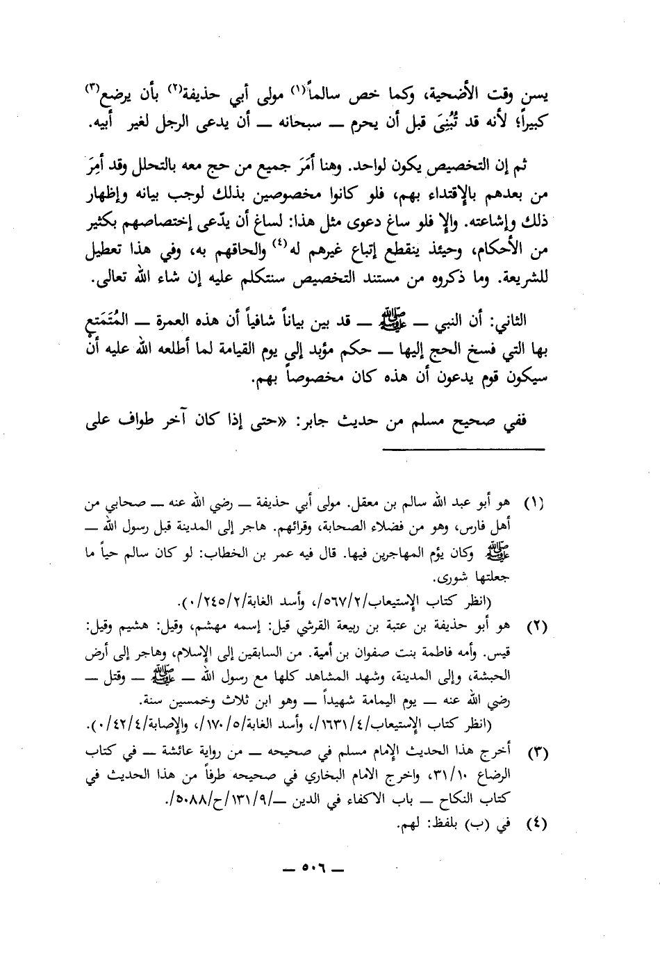 ثُمَّ إِنَّ التَّخْصِيصَ يَكُونُ لِوَاحِدٍ، وَهُنَا أَمَرَ جَمِيعَ مَنْ حَجَّ مَعَهُ بِالتَّحَلُّلِ، وَقَدْ أَمَرَ مَنْ بَعْدَهُمْ بِالِاقْتِدَاءِ بِهِمْ، فَلَوْ كَانُوا مَخْصُوصِينَ بِذَلِكَ لَوَجَبَ بَيَانُهُ وَإِظْهَارُ ذَلِكَ وَإِشَاعَتُهُ، وَإِلَّا فَلَوْ سَاغَ دَعْوَى مِثْلِ هَذَا؛ لَسَاغَ أَنْ يُدَّعَى اخْتِصَاصُهُمْ بِكَثِيرٍ مِنَ الْأَحْكَامِ، وَحِينَئِذٍ يَنْقَطِعُ اتِّبَاعُ غَيْرِهِمْ لَهُ وَإِلْحَاقُهُمْ بِهِ، وَفِي هَذَا تَعْطِيلٌ لِلشَّرِيعَةِ، وَمَا ذَكَرُوهُ مِنْ مُسْتَنَدِ التَّخْصِيصِ سَنَتَكَلَّمُ عَلَيْهِ إِنْ شَاءَ اللَّهُ تَعَالَى.