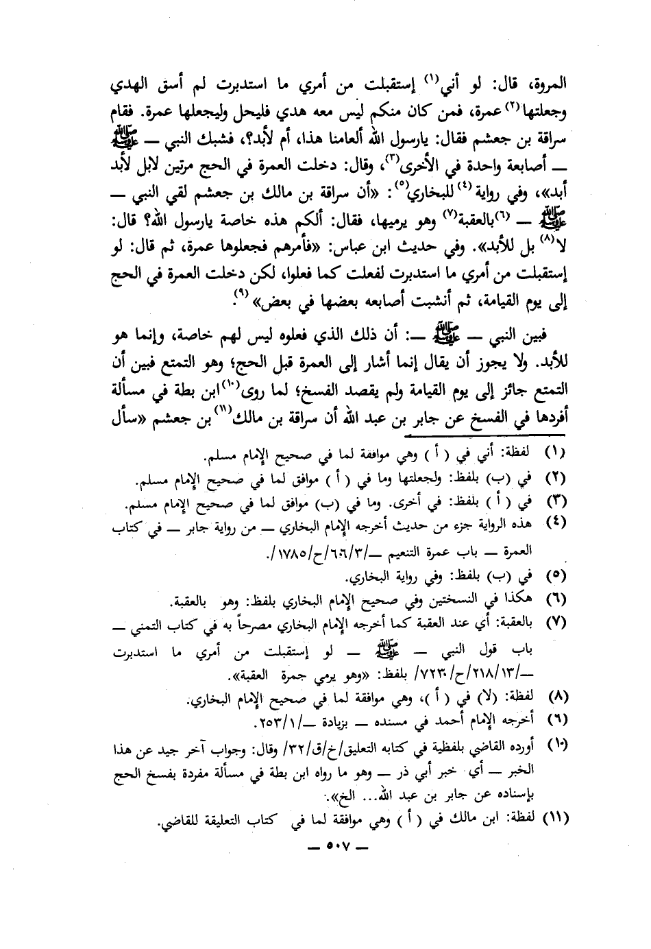 الْمَرْوَةِ، قَالَ: لَوْ أَنِّي اسْتَقْبَلْتُ مِنْ أَمْرِي مَا اسْتَدْبَرْتُ لَمْ أَسُقِ الْهَدْيَ وَجَعَلْتُهَا عُمْرَةً، فَمَنْ كَانَ مِنْكُمْ لَيْسَ مَعَهُ هَدْيٌ فَلْيَحِلَّ وَلْيَجْعَلْهَا عُمْرَةً. فَقَامَ سُرَاقَةُ بْنُ جُعْشُمٍ فَقَالَ: يَا رَسُولَ اللَّهِ، أَلِعَامِنَا هَذَا، أَمْ لِأَبَدٍ؟ فَشَبَّكَ النَّبِيُّ - صَلَّى اللَّهُ عَلَيْهِ وَسَلَّمَ - أَصَابِعَهُ وَاحِدَةً فِي الْأُخْرَى وَقَالَ: دَخَلَتِ الْعُمْرَةُ فِي الْحَجِّ مَرَّتَيْنِ، لَا بَلْ لِأَبَدِ أَبَدٍ» " وَفِي رِوَايَةٍ لِلْبُخَارِيِّ: " «أَنَّ سُرَاقَةَ بْنَ مَالِكِ بْنِ جُعْشُمٍ لَقِيَ النَّبِيَّ - صَلَّى اللَّهُ عَلَيْهِ وَسَلَّمَ - بِالْعَقَبَةِ وَهُوَ يَرْمِيهَا، فَقَالَ: أَلَكُمْ هَذِهِ خَاصَّةً يَا رَسُولَ اللَّهِ؟ قَالَ: لَا، بَلْ لِلْأَبَدِ» ". وَفِي حَدِيثِ ابْنِ عَبَّاسٍ: " «فَأَمَرَهُمْ فَجَعَلُوهَا عُمْرَةً، ثُمَّ قَالَ: لَوِ اسْتَقْبَلْتُ مِنْ أَمْرِي مَا اسْتَدْبَرْتُ لَفَعَلْتُ كَمَا فَعَلُوا، لَكِنْ دَخَلَتِ الْعُمْرَةُ فِي الْحَجِّ إِلَى يَوْمِ الْقِيَامَةِ، ثُمَّ أَنْشَبَتْ أَصَابِعُهُ بَعْضُهَا فِي بَعْضٍ» ".