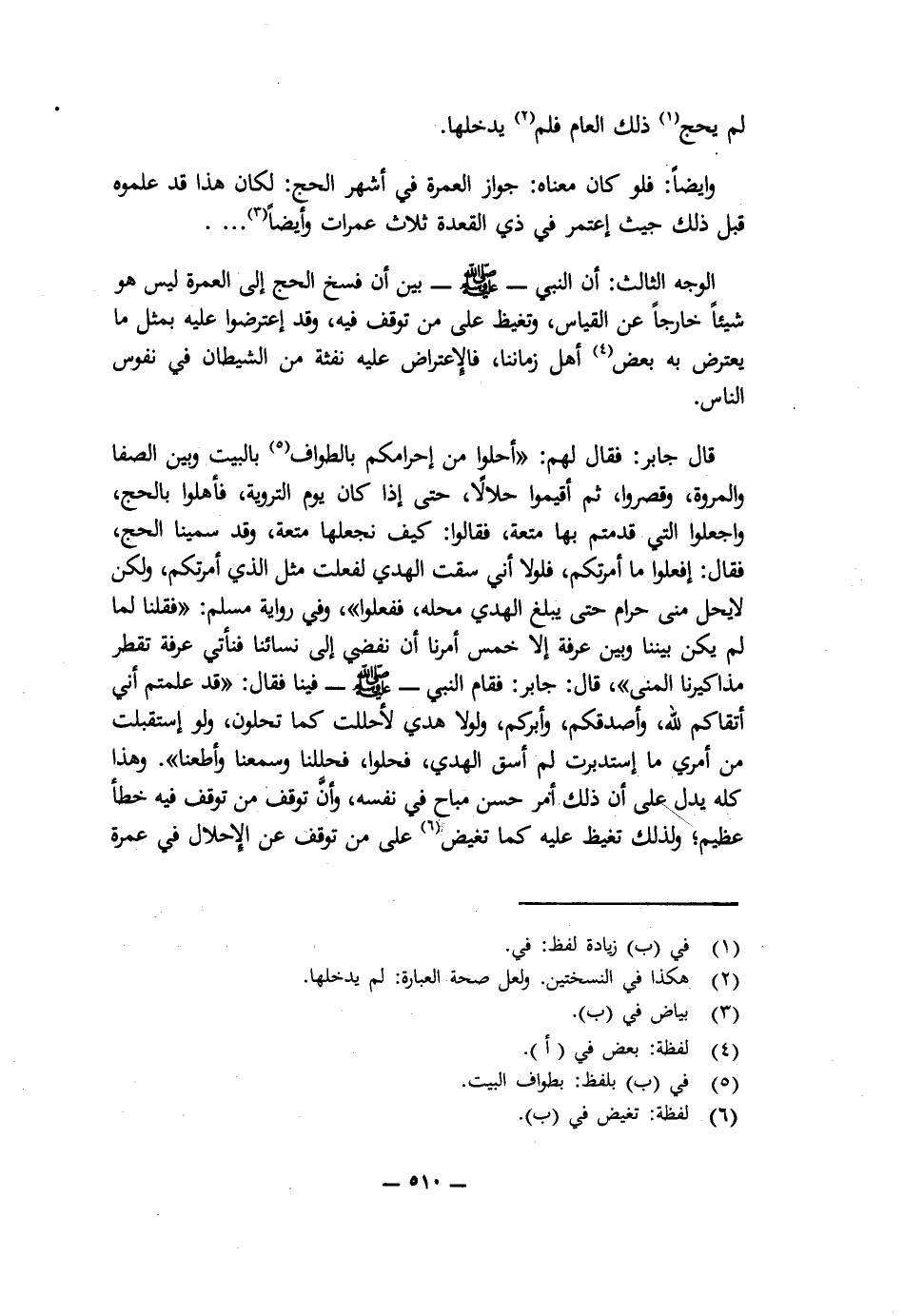 قَالَ جَابِرٌ: فَقَالَ لَهُمْ: " «أَحِلُّوا مِنْ إِحْرَامِكُمْ بِالطَّوَافِ بِالْبَيْتِ وَبَيْنَ الصَّفَا وَالْمَرْوَةِ، وَقَصِّرُوا، ثُمَّ أَقِيمُوا حَلَالًا حَتَّى إِذَا كَانَ يَوْمُ التَّرْوِيَةِ فَأَهِلُّوا بِالْحَجِّ، وَاجْعَلُوا الَّتِي قَدِمْتُمْ بِهَا مُتْعَةً، فَقَالُوا: كَيْفَ نَجْعَلُهَا مُتْعَةً وَقَدْ سَمَّيْنَا الْحَجَّ؟ فَقَالَ: افْعَلُوا مَا أَمَرْتُكُمْ، فَلَوْلَا أَنِّي سُقْتُ الْهَدْيَ لَفَعَلْتُ مِثْلَ الَّذِي أَمَرْتُكُمْ، وَلَكِنْ لَا يَحِلُّ مِنِّي حَرَامٌ حَتَّى يَبْلُغَ الْهَدْيُ مَحِلَّهُ، فَفَعَلُوا» " وَفِي رِوَايَةِ مُسْلِمٍ: " فَقُلْنَا «: لَمَّا لَمْ يَكُنْ بَيْنَنَا وَبَيْنَ عَرَفَةَ إِلَّا خَمْسٌ أُمِرْنَا أَنْ نُفْضِيَ إِلَى نِسَائِنَا، فَنَأْتِيَ عَرَفَةَ تَقْطُرُ مَذَاكِيرُنَا الْمَنِيَّ» " قَالَ جَابِرٌ: فَقَامَ النَّبِيُّ - صَلَّى اللَّهُ عَلَيْهِ وَسَلَّمَ - فِينَا فَقَالَ: " «قَدْ عَلِمْتُمْ أَنِّي أَتْقَاكُمْ لِلَّهِ، وَأَصْدَقُكُمْ، وَأَبَرُّكُمْ، وَلَوْلَا هَدْيٌ لَأَحْلَلْتُ كَمَا تُحِلُّونَ، وَلَوِ اسْتَقْبَلْتُ مِنْ أَمْرِي مَا اسْتَدْبَرْتُ لَمْ أَسُقِ الْهَدْيَ، فَحِلُّوا. فَحَلَلْنَا، وَسَمِعْنَا وَأَطَعْنَا» ". وَهَذَا كُلُّهُ يَدُلُّ عَلَى أَنَّ ذَلِكَ أَمْرٌ حَسَنٌ مُبَاحٌ فِي نَفْسِهِ، وَأَنَّ تَوَقُّفَ مَنْ تَوَقَّفَ فِيهِ خَطَأٌ عَظِيمٌ؛ وَلِذَلِكَ تَغَيَّظَ عَلَيْهِ كَمَا تَغَيَّظَ عَلَى مَنْ تَوَقَّفَ عَنِ الْإِحْلَالِ فِي عُمْرَةِ