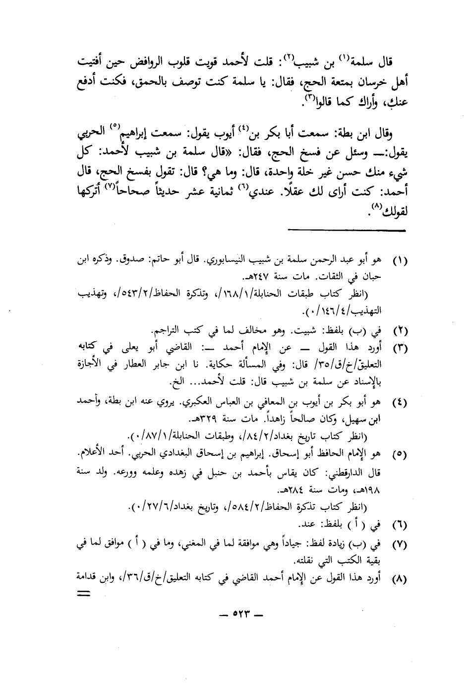 قَالَ سَلَمَةُ بْنُ شَبِيبٍ: قُلْتُ لِأَحْمَدَ: قَوِيَتْ قُلُوبُ الرَّوَافِضِ حِينَ أَفْتَيْتَ أَهْلَ خُرَسَانَ بِمُتْعَةِ الْحَجِّ، فَقَالَ: يَا سَلَمَةُ كُنْتَ تُوصَفُ بِالْحُمْقِ، فَكُنْتُ أَدْفَعُ عَنْكَ، وَأَرَاكَ كَمَا قَالُوا.