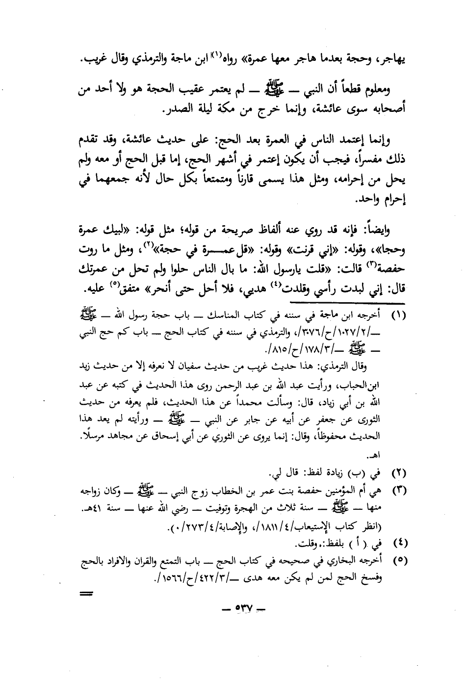 وَمَعْلُومٌ قَطْعًا أَنَّ النَّبِيَّ - صَلَّى اللَّهُ عَلَيْهِ وَسَلَّمَ - لَمْ يَعْتَمِرْ عَقِيبَ الْحَجَّةِ هُوَ وَلَا أَحَدٌ مِنْ أَصْحَابِهِ سِوَى عَائِشَةَ، وَإِنَّمَا خَرَجَ مِنْ مَكَّةَ لَيْلَةَ الصَّدَرِ.