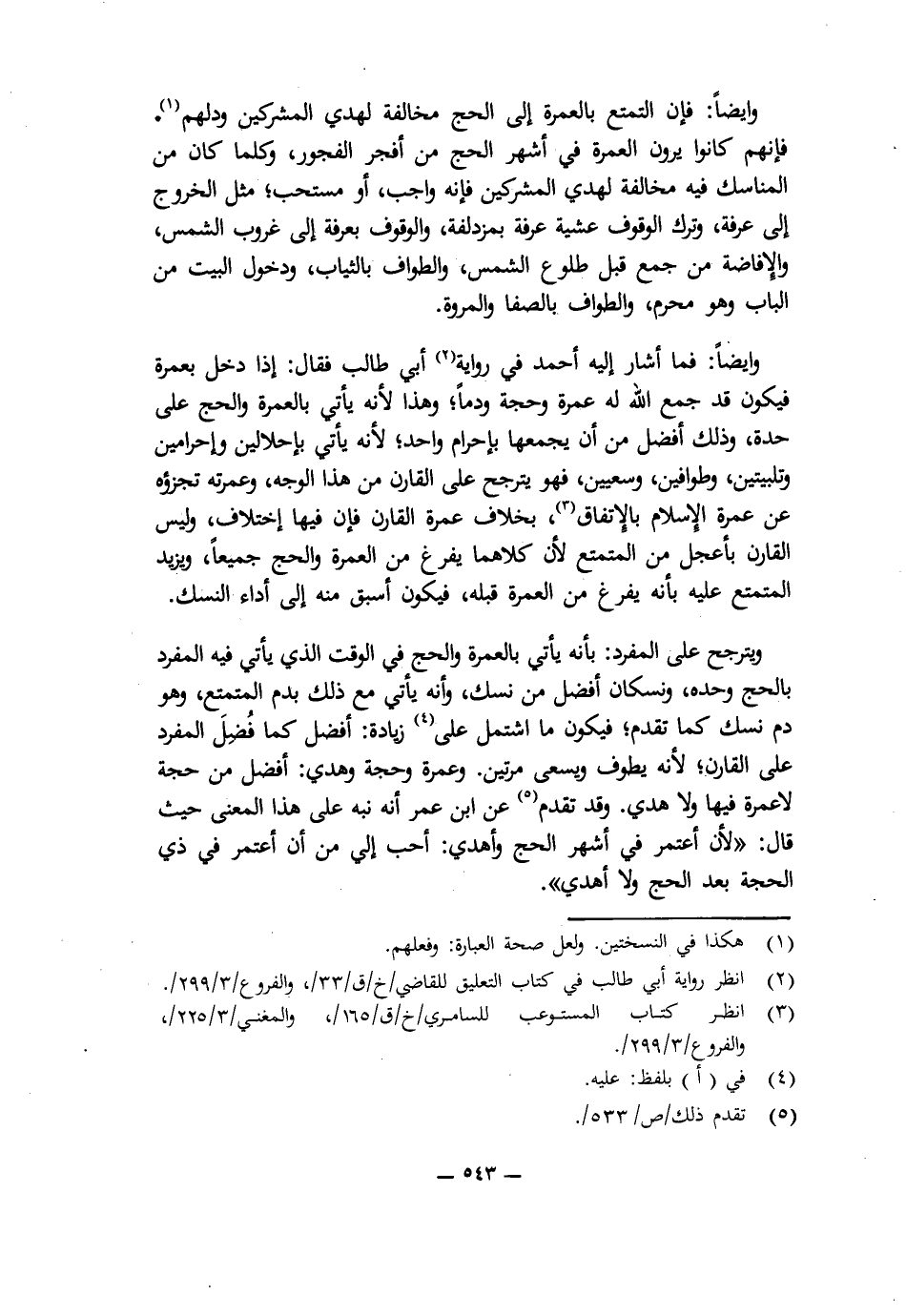وَأَيْضًا: فَمَا أَشَارَ إِلَيْهِ أَحْمَدُ فِي رِوَايَةِ أَبِي طَالِبٍ فَقَالَ: إِذَا دَخَلَ بِعُمْرَةٍ فَيَكُونُ قَدْ جَمَعَ اللَّهُ لَهُ عُمْرَةً وَحَجَّةً وَدَمًا؛ وَهَذَا لِأَنَّهُ يَأْتِي بِالْعُمْرَةِ وَالْحَجِّ عَلَى حِدَةٍ، وَذَلِكَ أَفْضَلُ مِنْ أَنْ يَجْمَعَهَا بِإِحْرَامٍ وَاحِدٍ؛ لِأَنَّهُ يَأْتِي بِإِحْلَالَيْنِ، وَإِحْرَامَيْنِ، وَتَلْبِيَتَيْنِ، وَطَوَافَيْنِ، وَسَعْيَيْنِ، فَهُوَ يَتَرَجَّحُ عَلَى الْقَارِنِ مِنْ هَذَا الْوَجْهِ، وَعُمْرَتُهُ تُجْزِئُهُ عَنْ عُمْرَةِ الْإِسْلَامِ بِالِاتِّفَاقِ بِخِلَافِ عُمْرَةِ الْقَارِنِ فَإِنَّ فِيهَا اخْتِلَافًا، وَلَيْسَ الْقَارِنُ بِأَعْجَلَ مِنَ الْمُتَمَتِّعِ؛ لِأَنَّ كِلَاهُمَا يَفْرُغُ مِنَ الْعُمْرَةِ وَالْحَجِّ جَمِيعًا، وَيَزِيدُ الْمُتَمَتِّعُ عَلَيْهِ بِأَنَّهُ يَفْرُغُ مِنَ الْعُمْرَةِ قَبْلَهُ، فَيَكُونُ أَسْبَقَ مِنْهُ إِلَى أَدَاءِ النُّسُكِ.