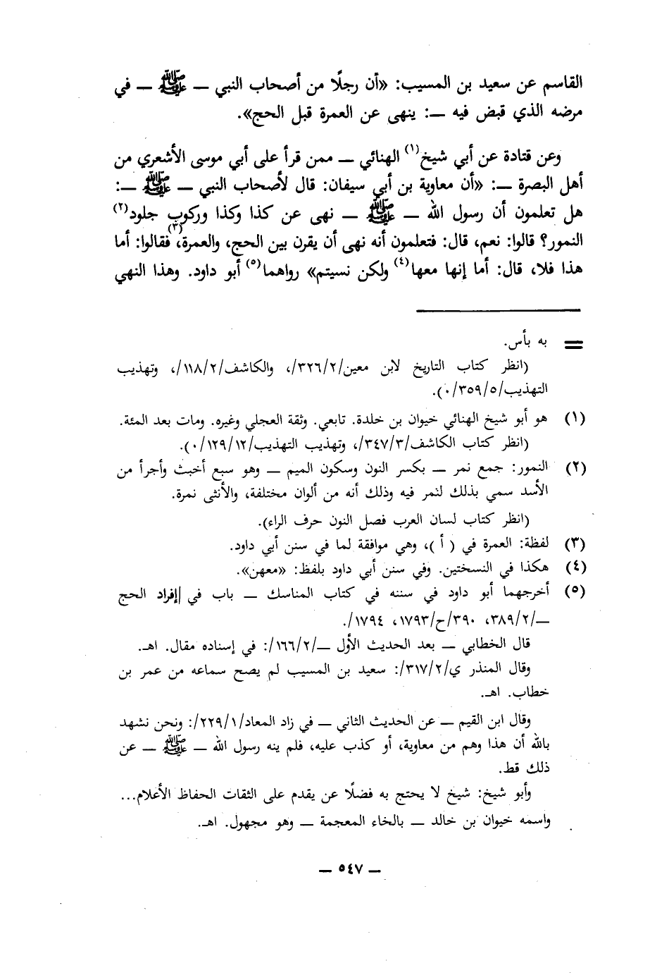 وَعَنْ قَتَادَةَ عَنْ أَبِي شَيْخٍ الْهُنَائِيِّ - مِمَّنْ قَرَأَ عَلَى أَبِي مُوسَى الْأَشْعَرِيِّ مِنْ أَهْلِ الْبَصْرَةِ -: " «أَنَّ مُعَاوِيَةَ بْنَ أَبِي سُفْيَانَ قَالَ لِأَصْحَابِ النَّبِيِّ - صَلَّى اللَّهُ عَلَيْهِ وَسَلَّمَ - هَلْ تَعْلَمُونَ أَنَّ رَسُولَ اللَّهِ - صَلَّى اللَّهُ عَلَيْهِ وَسَلَّمَ - نَهَى عَنْ كَذَا وَكَذَا، وَرُكُوبِ جُلُودِ النُّمُورِ؟ قَالُوا: نَعَمْ، قَالَ: فَتَعْلَمُونَ أَنَّهُ نَهَى أَنْ يُقْرَنَ بَيْنَ الْحَجِّ وَالْعُمْرَةِ، فَقَالُوا: أَمَّا هَذَا فَلَا، قَالَ: أَمَا إِنَّهَا مَعَهَا وَلَكِنْ نَسِيتُمْ» " رَوَاهُمَا أَبُو دَاوُدَ. وَهَذَا النَّهْيُ