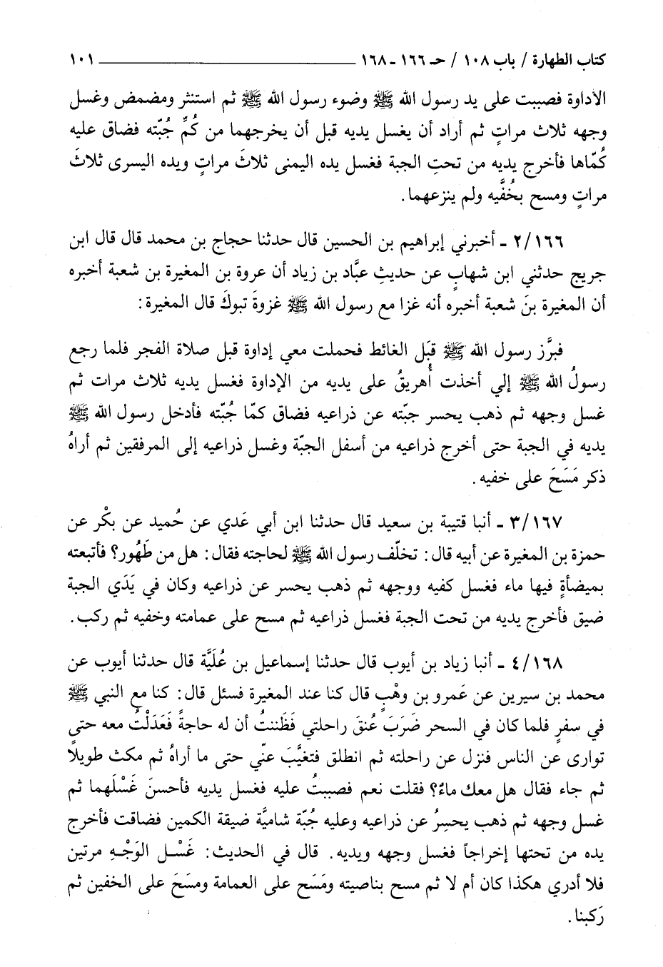 168 - أنبأ زياد بن أيوب قال حدثنا إسماعيل بن علية قال حدثنا أيوب عن محمد بن سيرين عن عمرو بن وهب قال كنا عند المغيرة فسئل قال : كنا مع النبي صلى الله عليه و سلم في سفر فلما كان في السحر ضرب عنق راحلتي فظننت أن له حاجة فعدلت معه حتى توارى عن الناس فنزل عن راحلته ثم انطلق فتغيب عني حتى ما أراه ثم مكث طويلا ثم جاء فقال هل معك ماء فقلت نعم فصببت عليه فغسل يديه فأحسن غسلهما ثم غسل وجهه ثم ذهب يحسر عن ذراعيه وعليه جبة شامية ضيقة الكمين فضاقت فأخرج يده من تحتها إخراجا فغسل وجهه ويديه قال في الحديث غسل الوجه مرتين فلا أدري هكذا كان أم لا ثم مسح بناصيته ومسح على العمامة ومسح على الخفين ثم ركبنا