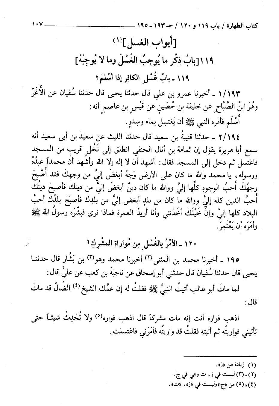193 - أخبرنا عمرو بن علي قال حدثنا يحيى قال حدثنا سفيان عن الأغر وهو بن الصباح عن خليفة بن حصين عن قيس بن عاصم : أنه أسلم فأمره النبي صلى الله عليه و سلم أن يغتسل بماء وسدر