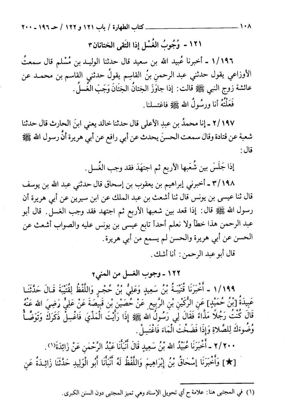 196 - أخبرنا عبيد الله بن سعيد قال حدثنا الوليد بن مسلم قال سمعت الأوزاعي يقول حدثني عبد الرحمن بن القاسم يقول حدثني القاسم بن محمد عن عائشة زوج النبي صلى الله عليه و سلم قالت : إذا جاوز الختان الختان وجب الغسل فعلته أنا ورسول الله صلى الله عليه و سلم فاغتسلنا