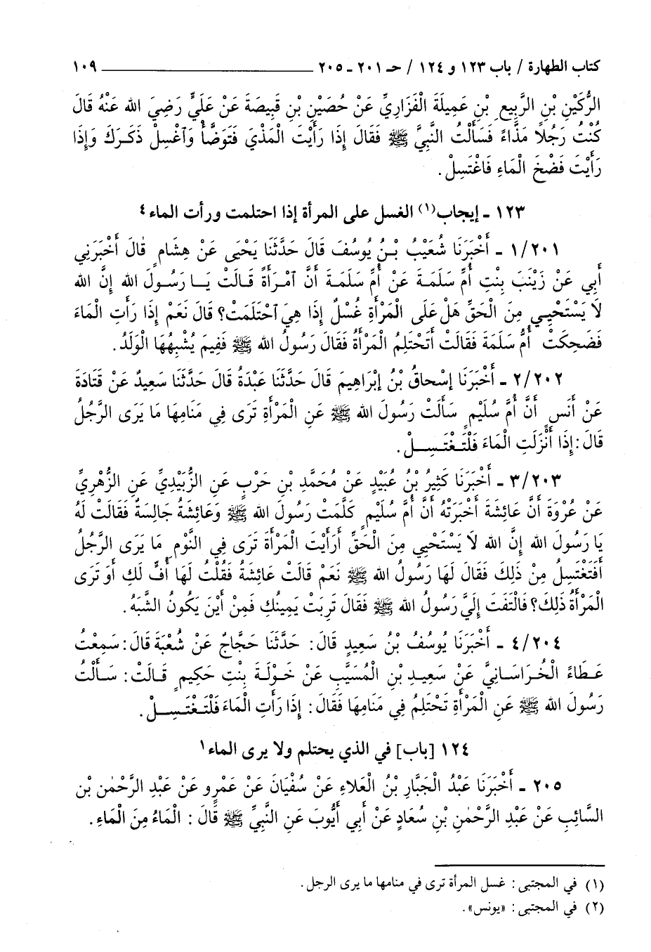 202 - أخبرنا إسحاق بن إبراهيم قال حدثنا عبدة قال حدثنا سعيد عن قتادة عن أنس : أن أم سليم سألت رسول الله صلى الله عليه و سلم عن المرأة ترى في منامها ما يرى الرجل قال إذا أنزلت الماء فلتغتسل