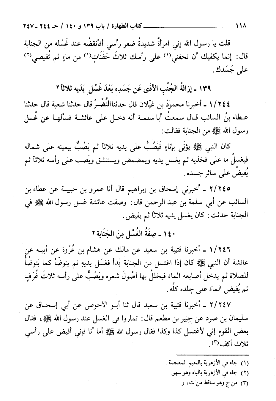 247 - أخبرنا قتيبة بن سعيد قال ثنا أبو الأحوص عن أبي إسحاق عن سليمان بن صرد عن جبير بن مطعم قال : تماروا في الغسل عند رسول الله صلى الله عليه و سلم فقال بعض القوم إني لأغتسل كذا وكذا فقال رسول الله صلى الله عليه و سلم أما أنا فإني أفيض على رأسي ثلاث أكف