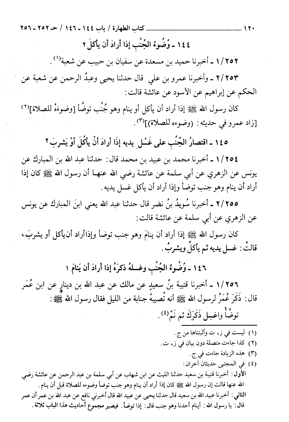 255 - أخبرنا سويد بن نضر قال حدثنا عبد الله يعني بن المبارك عن يونس عن الزهري عن أبي سلمة عن عائشة قالت : كان رسول الله صلى الله عليه و سلم إذا أراد أن ينام وهو جنب توضأ وإذا أراد أن يأكل أو يشرب قالت غسل يديه ثم يأكل ويشرب