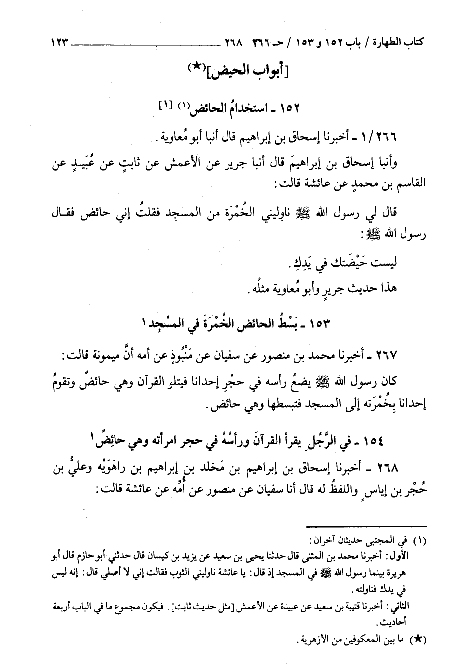 266 - أخبرنا إسحاق بن إبراهيم قال أنبأ أبو معاوية وأنبأ إسحاق بن إبراهيم قال أنبأ جرير عن الأعمش عن ثابت عن عبيد عن القاسم بن محمد عن عائشة قالت قال لي رسول الله صلى الله عليه و سلم : ناوليني الخمرة من المسجد فقلت إني حائض فقال رسول الله صلى الله عليه و سلم ليست حيضتك في يدك هذا حديث جرير وأبو معاوية مثله