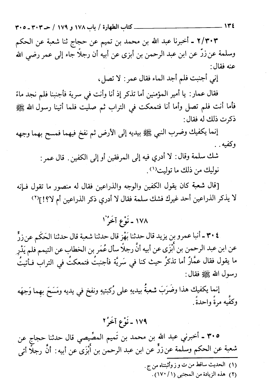 303 - أخبرنا عبد الله بن محمد بن تميم عن حجاج ثنا شعبة عن الحكم وسلمة عن زر عن بن عبد الرحمن بن أبزى عن أبيه : أن رجلا جاء إلى عمر رضي الله عنه فقال إني أجنبت فلم أجد الماء فقال عمر لا تصل فقال عمار يا أمير المؤمنين أما تذكر إذ أنا وأنت في سرية فأجنبنا فلم نجد ماء فأما أنت فلم تصل وأما أنا فتمعكت في التراب ثم صليت فلما أتينا رسول الله صلى الله عليه و سلم ذكرت ذلك له فقال إنما يكفيك وضرب النبي صلى الله عليه و سلم بيديه إلى الأرض ثم نفخ فيهما فمسح بهما وجهه وكفيه شك سلمة وقال لا أدري فيه إلى المرفقين أو إلى الكفين قال عمر نوليك من ذلك ما توليت قال شعبة كان يقول الكفين والوجه والذراعين فقال له منصور ما تقول فإنه لا يذكر الذراعين أحد غيرك فشك سلمة فقال لا أدري ذكر الذراعين أم لا