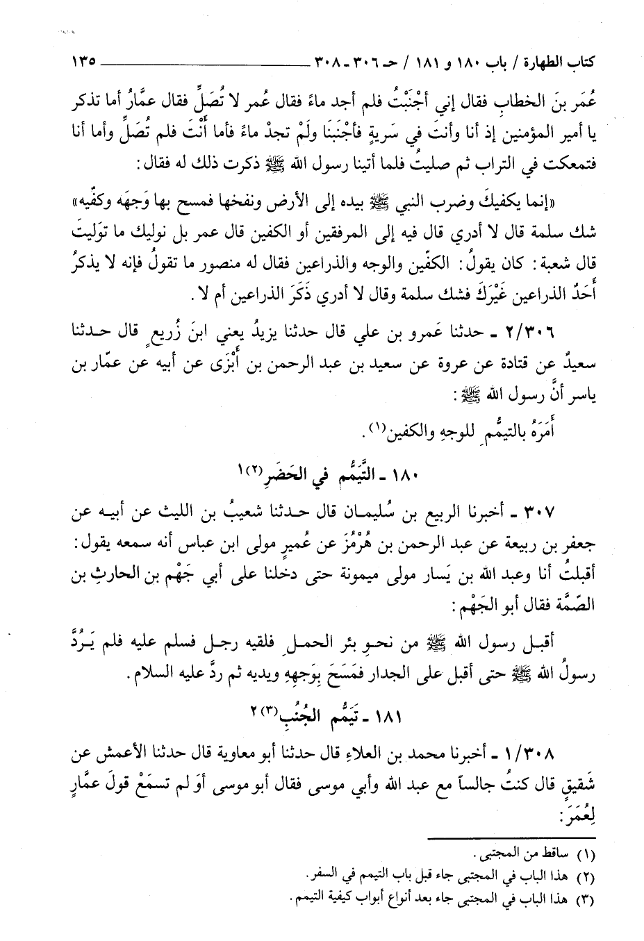 307 - أخبرنا الربيع بن سليمان قال حدثنا شعيب بن الليث عن أبيه عن جعفر بن ربيعة عن عبد الرحمن بن هرمز عن عمير مولى بن عباس أنه سمعه يقول أقبلت أنا وعبد الله بن يسار مولى ميمونة حتى دخلنا على أبي جهم بن الحارث بن الصمة فقال أبو الجهم : أقبل رسول الله صلى الله عليه و سلم من نحو بئر الحمل فلقيه رجل فسلم عليه فلم يرد رسول الله صلى الله عليه و سلم حتى أقبل على الجدار فمسح بوجهه ويديه ثم رد عليه السلام