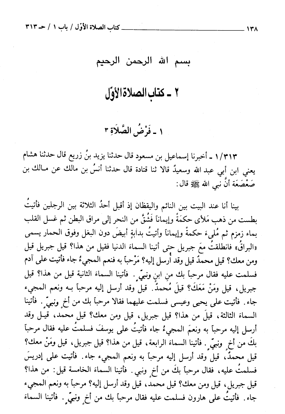 313 - أخبرنا إسماعيل بن مسعود قال حدثنا يزيد بن زريع قال حدثنا هشام يعني بن أبي عبد الله وسعيد قالا ثنا قتادة قال حدثنا أنس بن مالك عن مالك بن صعصعة أن نبي الله صلى الله عليه و سلم قال : بينا أنا عند البيت بين النائم واليقظان إذ أقبل أحد الثلاثة بين الرجلين فأتيت بطست من ذهب ملأى حكمة وإيمانا فشق من النحر إلى مراق البطن ثم غسل القلب بماء زمزم ثم ملىء حكمة وإيمانا وأتيت بدابة أبيض دون البغل وفوق الحمار يسمى البراق فانطلقت مع جبريل حتى أتينا السماء الدنيا فقيل من هذا قيل جبريل قيل ومن معك قيل محمد قيل وقد أرسل إليه مرحبا به فنعم المجيء جاء فأتيت على آدم فسلمت عليه فقال مرحبا بك من بن ونبي فأتينا السماء الثانية قيل من هذا قيل جبريل قيل ومن معك قيل محمد قيل وقد أرسل إليه مرحبا به ونعم المجيء جاء فأتيت على يحيى وعيسى فسلمت عليهما فقالا مرحبا بك من أخ ونبي فأتينا السماء الثالثة قيل من هذا قيل جبريل قيل ومن معك قيل محمد قيل وقد أرسل إليه مرحبا به ونعم المجيء جاء فأتيت على يوسف فسلمت عليه فقال مرحبا بك من أخ ونبي فأتينا السماء الرابعة قيل من هذا قيل جبريل قيل ومن معك قيل محمد قيل وقد أرسل إليه مرحبا به ونعم المجيء جاء فأتيت على إدريس فسلمت عليه فقال مرحبا بك من أخ ونبي فأتينا السماء الخامسة قيل من هذا قيل جبريل قيل ومن معك قيل محمد قيل وقد أرسل إليه مرحبا به ونعم المجيء جاء فأتيت على هارون فسلمت عليه فقال مرحبا بك من أخ ونبي فأتينا السماء [ ص 139 ] السادسة قيل من هذا قيل جبريل قيل ومن معك قيل محمد قيل وقد أرسل إليه مرحبا به ونعم المجيء جاء فأتيت على موسى فسلمت عليه فقال مرحبا بك من أخ ونبي فلما جاوزت بكى قيل ما أبكاك قال رب هذا الغلام بعثته بعدي يدخل الجنة من أمته أفضل مما يدخل من أمتي فأتينا السماء السابعة قيل من هذا قيل جبريل قيل ومن معك قيل محمد قيل وقد أرسل إليه مرحبا به ونعم المجيء جاء فأتيت على إبراهيم فسلمت عليه فقال مرحبا بك من بن ونبي فرفع لي البيت المعمور فسألت جبريل فقال هذا البيت المعمور يصلي فيه كل يوم سبعون ألف ملك إذا خرجوا منه لم يعودوا إليه آخر ما عليهم ورفعت لي سدرة المنتهى فإذا نبقها كأنه قلال هجر وإذا ورقها كآذان الفيول وإذا في أصلها أربعة أنهار نهران باطنان ونهران ظاهران فسألت جبريل فقال أما الباطنان ثم ذكر كلمة معناها فنهرا الجنة وأما الظاهران فالفرات والنيل قال ثم فرض علي خمسون صلاة فأقبلت حتى أتيت على موسى قال ما صنعت قلت فرضت علي خمسون صلاة قال أنا أعلم بالناس منك قد عالجت بني إسرائيل أشد المعالجة وإن أمتك لن تطيق ذلك فارجع إلى ربك فاسأله يخفف عنك فرجعت إلى ربي فجعلها أربعين صلاة فأقبلت حتى أتيت على موسى فقال ما صنعت قلت جعلها أربعين صلاة قال أنا أعلم بالناس منك وقد عالجت بني إسرائيل أشد المعالجة وإن أمتك لن تطيق ذلك فارجع إلى ربك فاسأله أن يخفف عنك فرجعت إلى ربي فسألته أن يخفف عني فجعلها ثلاثين صلاة فأقبلت حتى أتيت على موسى فقال ما صنعت فقلت جعلها ثلاثين صلاة قال إني أعلم بالناس منك وقد عالجت بني إسرائيل أشد المعالجة وإن أمتك لن يطيقوا ذلك فارجع إلى ربك فاسأله أن يخفف عنك فرجعت إلى ربي فسألته أن يخفف عني فجعلها عشرين فأقبلت حتى أتيت على موسى فقال ما صنعت فقلت جعلها عشرين صلاة قال إني أعلم بالناس منك وقد عالجت بني إسرائيل أشد المعالجة وإن أمتك لن يطيقوا ذلك فارجع إلى ربك فاسأله أن يخفف عنك فرجعت إلى ربي فسألته أن يخفف عني فجعلها عشر صلوات فأقبلت حتى أتيت موسى فقال ما صنعت قلت جعلها عشر صلوات قال إني أعلم بالناس منك وقد عالجت بني إسرائيل أشد المعالجة وإن أمتك لن يطيقوا ذلك فارجع إلى ربك فاسأله أن يخفف عنك فرجعت إلى ربي فسألته أن يخفف عني فجعلها خمس صلوات فأقبلت حتى أتيت على موسى فقال ما صنعت قلت جعلها خمس صلوات قال إني أعلم بالناس منك وقد عالجت بني إسرائيل أشد المعالجة وإن أمتك لن يطيقوا ذلك فارجع إلى ربك فاسأله أن يخفف عنك قلت رضيت وسلمت فنودي أن قد أمضيت فريضتي وخفف