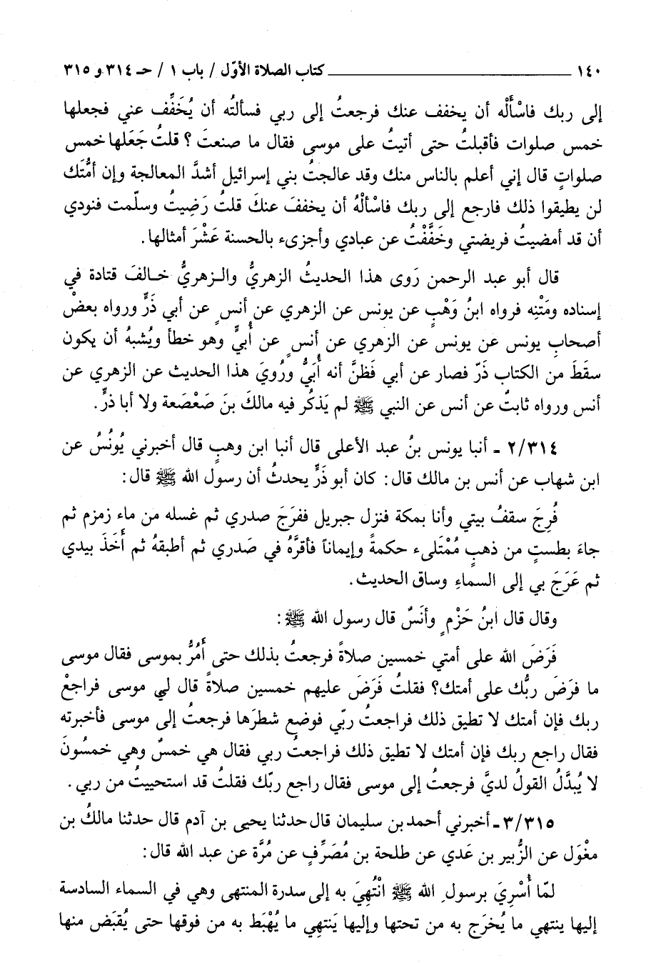 314 - أنبأ يونس بن عبد الأعلى قال أنبأ بن وهب قال أخبرني يونس عن بن شهاب عن أنس بن مالك قال كان أبو ذر يحدث أن رسول الله صلى الله عليه و سلم قال : فرج سقف بيتي وأنا بمكة فنزل جبريل ففرج صدري ثم غسله من ماء زمزم ثم جاء بطست من ذهب ممتلئ حكمة وإيمانا فأقره في صدري ثم أطبقه ثم أخذ بيدي ثم عرج بي إلى السماء وساق الحديث وقال قال بن حزم وأنس قال رسول الله صلى الله عليه و سلم فرض الله على أمتى خمسين صلاة فرجعت بذلك حتى أمر بموسى فقال موسى ما فرض ربك على أمتك فقلت فرض عليهم خمسين صلاة قال لي موسى فراجع ربك فإن أمتك لا تطيق ذلك فراجعت ربي فوضع شطرها فرجعت إلى موسى فأخبرته فقال راجع ربك فإن أمتك لا تطيق ذلك فراجعت ربي فقال هي خمس وهي خمسون لا يبدل القول لدي فرجعت إلى موسى فقال راجع ربك فقلت قد استحييت من ربي