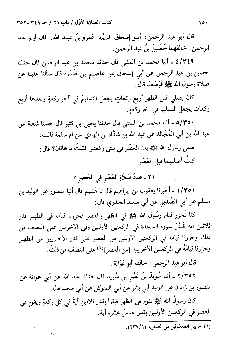 351 - أخبرنا يعقوب بن إبراهيم قال نا هشيم قال أنبأ منصور عن الوليد بن مسلم عن أبي الصديق عن أبي سعيد الخدري قال : كنا نحزر قيام رسول الله صلى الله عليه و سلم في الظهر والعصر فحزرنا قيامه في الظهر قدر ثلاثين آية قدر سورة السجدة في الركعتين الأوليين وفي الآخريين على النصف من ذلك وحزرنا قيامه في الركعتين الأوليين من العصر على قدر الأخريين من الظهر وحزرنا قيامه في الركعتين الأخريين من العصر على النصف من ذلك قال أبو عبد الرحمن خالفه أبو عوانة