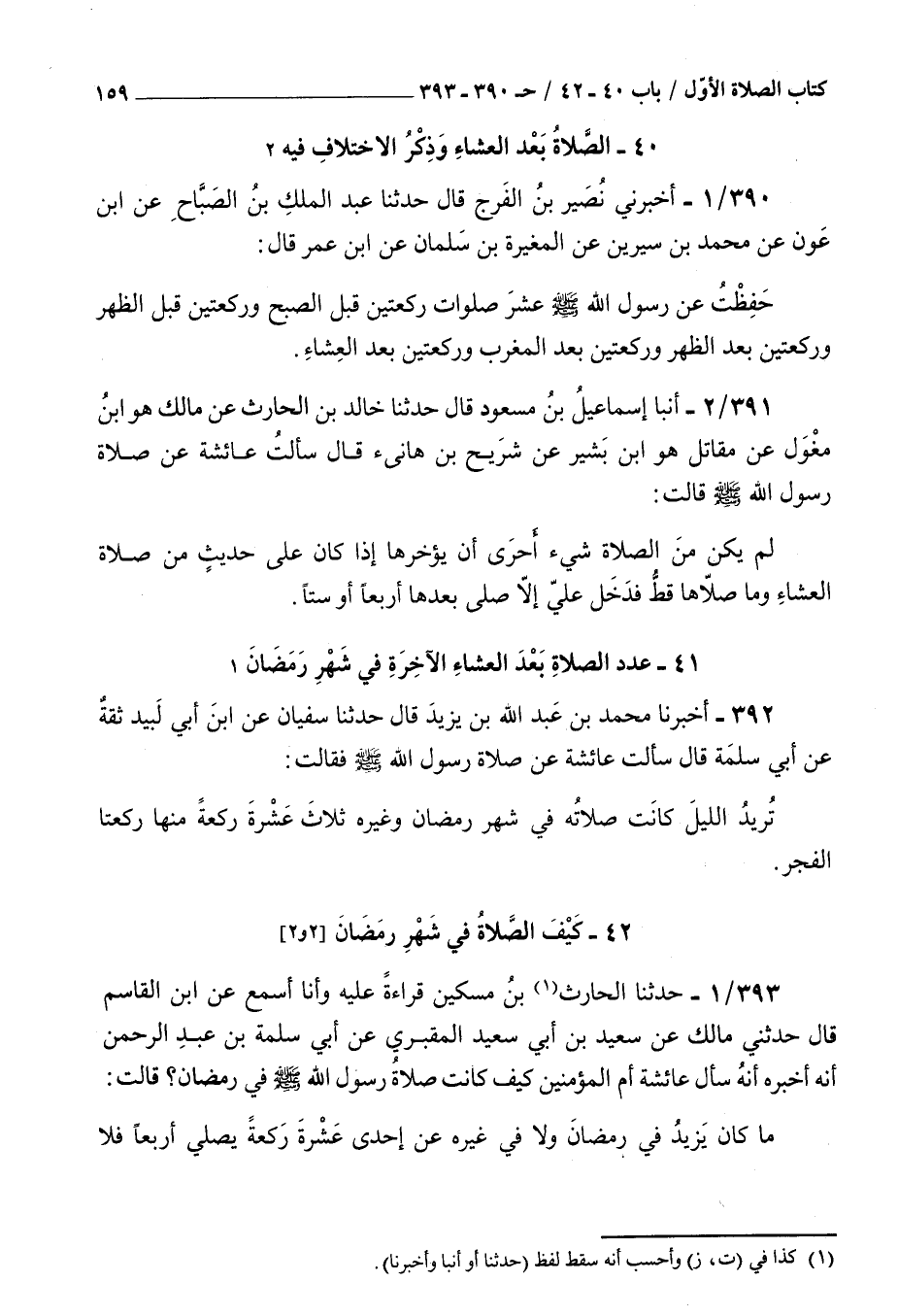 393 - حدثنا الحارث بن مسكين قراءة عليه وأنا أسمع عن بن القاسم قال حدثني مالك عن سعيد بن أبي سعيد المقبري عن أبي سلمة بن عبد الرحمن أنه أخبره : أنه سأل عائشة أم المؤمنين كيف كانت صلاة رسول الله صلى الله عليه و سلم في رمضان قالت ما كان يزيد في رمضان ولا في غيره عن إحدى عشرة ركعة يصلي أربعا فلا تسأل عن حسنهن وطولهن ثم يصلي أربعا فلا تسأل عن حسنهن وطولهن ثم يصلي ثلاثا قالت عائشة فقلت يا رسول الله أتنام قبل أن توتر قال يا عائشة إن عيني تنامان ولا ينام قلبي أبو سعيد اسمه كيسان خالفهما أبو إسحاق