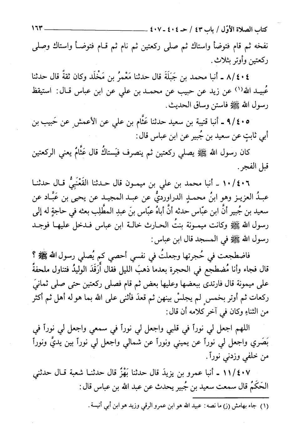 406 - أنبأ محمد بن علي بن ميمون قال حدثنا القعنبي قال حدثنا عبد العزيز وهو بن محمد الدراوردي عن عبد المجيد عن يحيى بن عباد عن سعيد بن جبير أنا بن عباس حدثه : أن أباه عباس بن عبد المطلب بعثه في حاجة له إلى رسول الله صلى الله عليه و سلم وكانت ميمونة بنت الحارث خالة بن عباس فدخل عليها فوجد رسول الله صلى الله عليه و سلم في المسجد قال بن عباس فاضطجعت في حجرتها وجعلت في نفسي أحصي كم يصلي رسول الله صلى الله عليه و سلم قال فجاء وأنا مضطجع في الحجرة بعدما ذهب الليل فقال أرقد الوليد فتناول ملحفة على ميمونة قال فارتدى ببعضها وعليها بعض ثم قام فصلى ركعتين حتى صلى ثماني ركعات ثم أوتر بخمس لم يجلس بينهن ثم قعد فأثنى على الله بما هو له أهل ثم أكثر من الثناء وكان في آخر كلامه أن قال اللهم اجعل لي نورا في قلبي واجعل لي نورا في سمعي واجعل لي نورا في بصري واجعل لي نورا عن يميني ونورا عن شمالي واجعل لي نورا بين يدي ونورا من خلفي وزدني نورا