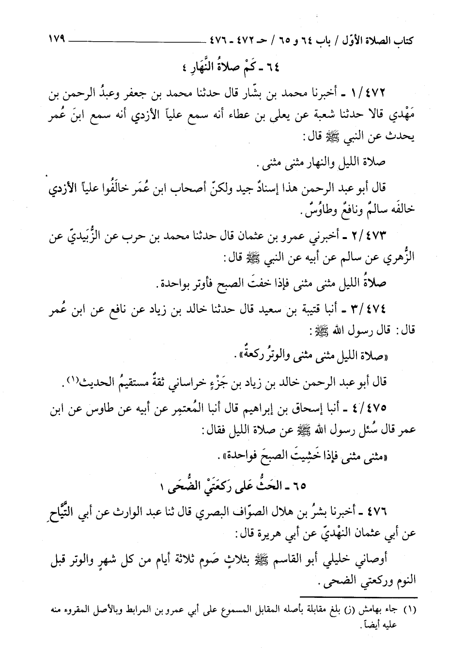 472 - أخبرنا محمد بن بشار قال حدثنا محمد بن جعفر وعبد الرحمن بن مهدي قالا حدثنا شعبة عن يعلى بن عطاء أنه سمع عليا الأزدي أنه سمع بن عمر يحدث عن النبي صلى الله عليه و سلم قال : صلاة الليل والنهار مثنى مثنى قال أبو عبد الرحمن هذا إسناد جيد ولكن أصحاب بن عمر خالفوا عليا الأزدي خالفه سالم ونافع وطاوس