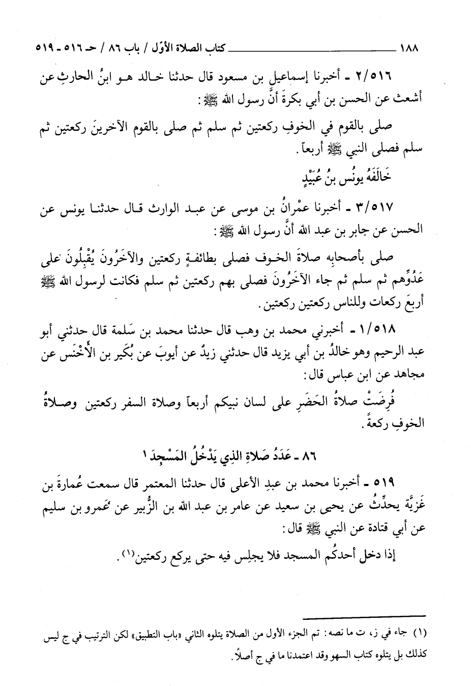 518 - أخبرني محمد بن وهب قال حدثنا محمد بن سلمة قال حدثني أبو عبد الرحيم وهو خالد بن أبي يزيد قال حدثني زيد عن أيوب عن بكير بن الأخنس عن مجاهد عن بن عباس قال : فرضت صلاة الحضر على لسان نبيكم أربعا وصلاة السفر ركعتين وصلاة الخوف ركعة