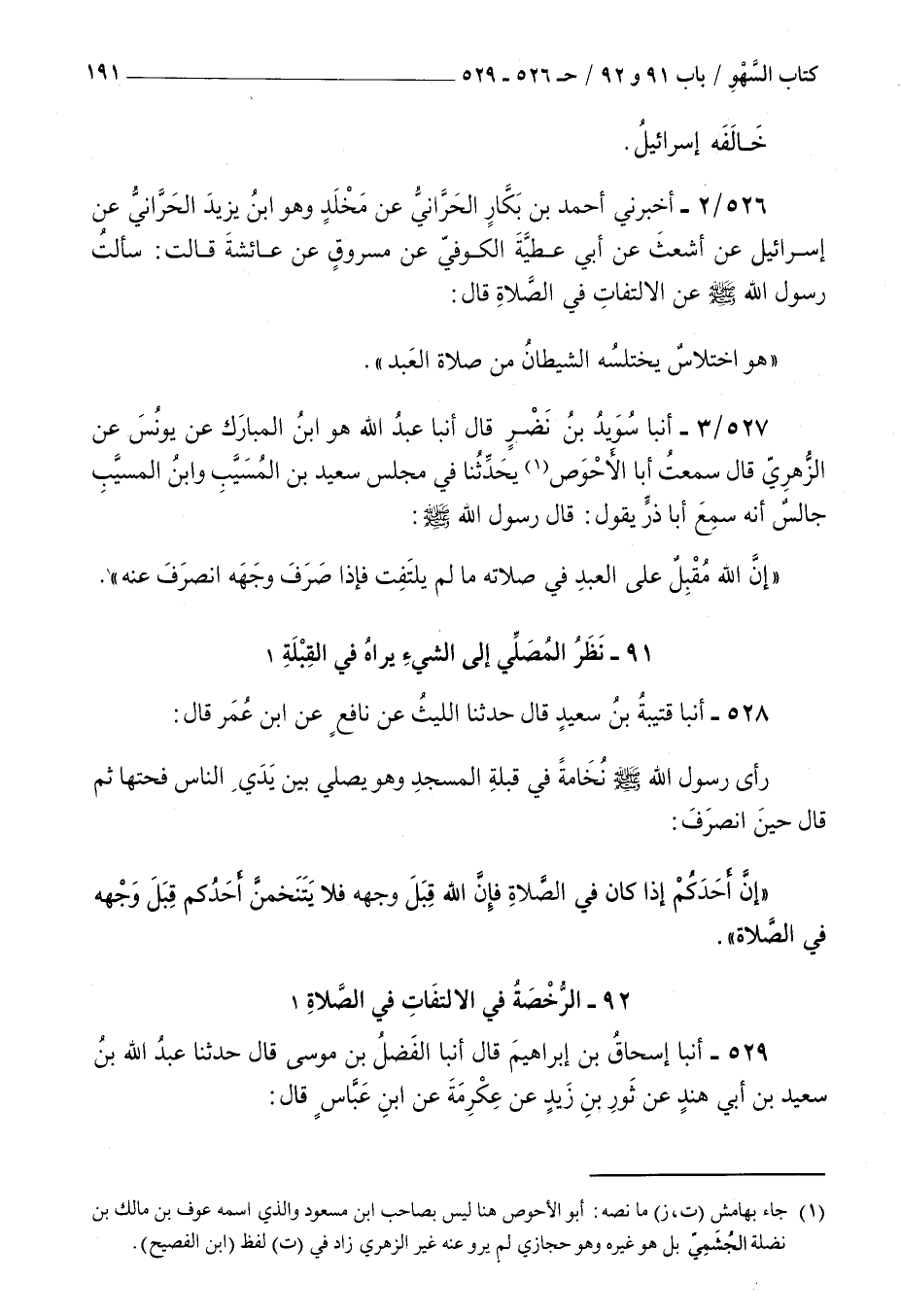 526 - أخبرني أحمد بن بكار الحراني عن مخلد وهو بن يزيد الحراني عن إسرائيل عن أشعث عن أبي عطية الكوفي عن مسروق عن عائشة قالت : سألت رسول الله صلى الله عليه و سلم عن الالتفات في الصلاة قال هو اختلاس يختلسه الشيطان من صلاة العبد