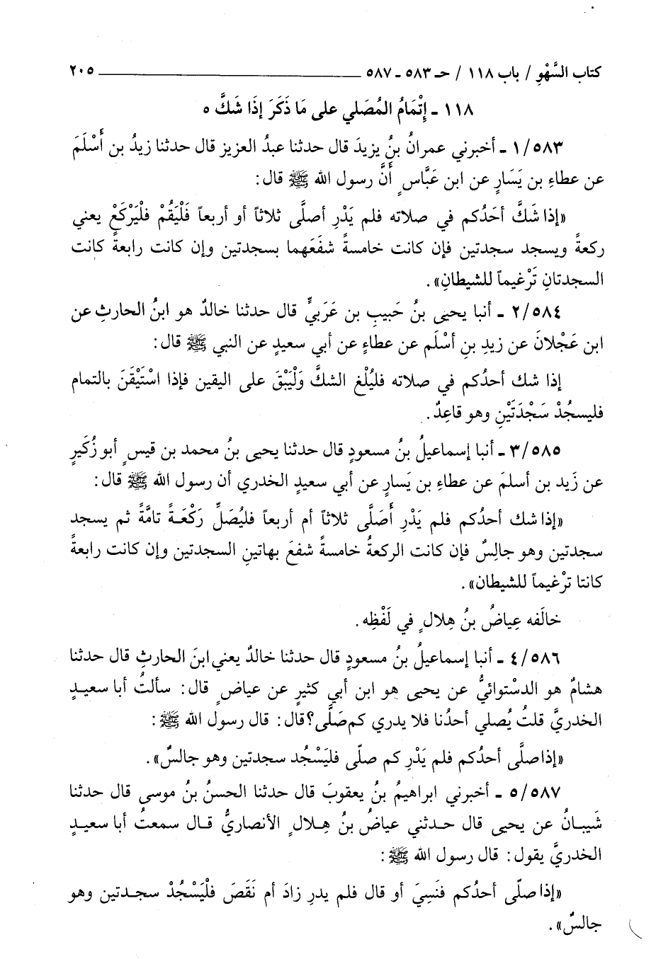 585 - أنبأ إسماعيل بن مسعود قال حدثنا يحيى بن محمد بن قيس أبو زكير عن زيد بن أسلم عن عطاء بن يسار عن أبي سعيد الخدري أن رسول الله صلى الله عليه و سلم قال : إذا شك أحدكم فلم يدر أصلى ثلاثا أم أربعا فليصل ركعة تامة ثم يسجد سجدتين وهو جالس فإن كانت الركعة خامسة شفع بهاتين السجدتين وإن كانت رابعة كانتا ترغيما للشيطان خالفه عياض بن هلال في لفظه