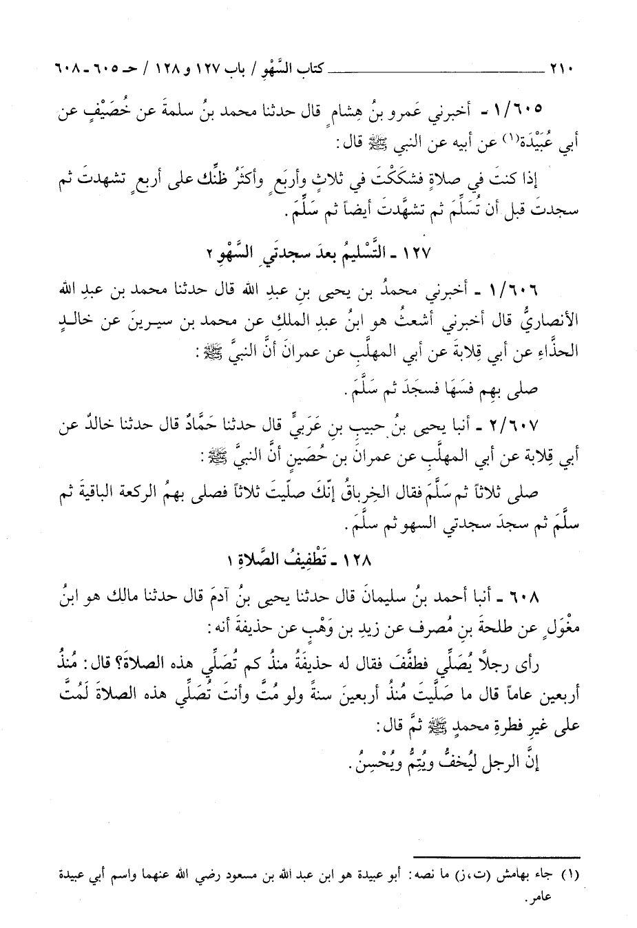 608 - أنبأ أحمد بن سليمان قال حدثنا يحيى بن آدم قال حدثنا مالك هو بن مغول عن طلحة بن مصرف عن زيد بن وهب عن حذيفة : أنه رأى رجلا يصلي فطفف فقال له حذيفة منذ كم تصلي هذه الصلاة قال منذ أربعين عاما قال ما صليت منذ أربعين سنة ولو مت وأنت تصلي هذه الصلاة لمت على غير فطرة محمد صلى الله عليه و سلم ثم قال إن الرجل ليخف ويتم ويحسن