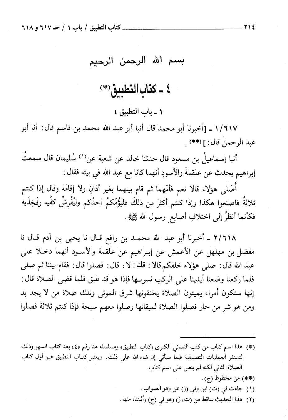 618 - أخبرنا أبو عبد الله محمد بن رافع قال نا يحيى بن آدم قال نا مفضل بن مهلهل عن الأعمش عن إبراهيم عن علقمة والأسود : أنهما دخلا على عبد الله قال صلى هؤلاء خلفكم قالا قلنا لا قال فصلوا قال فقام بيننا ثم صلى فلما ركعنا وضعنا أيدينا على الركب نسربها فإذا هو قد طبق فلما قضى الصلاة قال إنها ستكون أمراء يميتون الصلاة يخنقونها شرق الموتى وتلك صلاة من لا يجد بد ومن هو شر من حار فصلوا الصلاة لميقاتها وصلوا معهم سبحة فإذا كنتم ثلاثة فصلوا جميعا وإذا كنتم أكثر فليؤمكم أحدكم فإذا ركع أحدكم فليضع يديه بين ركبتيه أو بين فخذيه وانجبى فكأني أنظر إلى اختلاف أصابع رسول الله صلى الله عليه و سلم