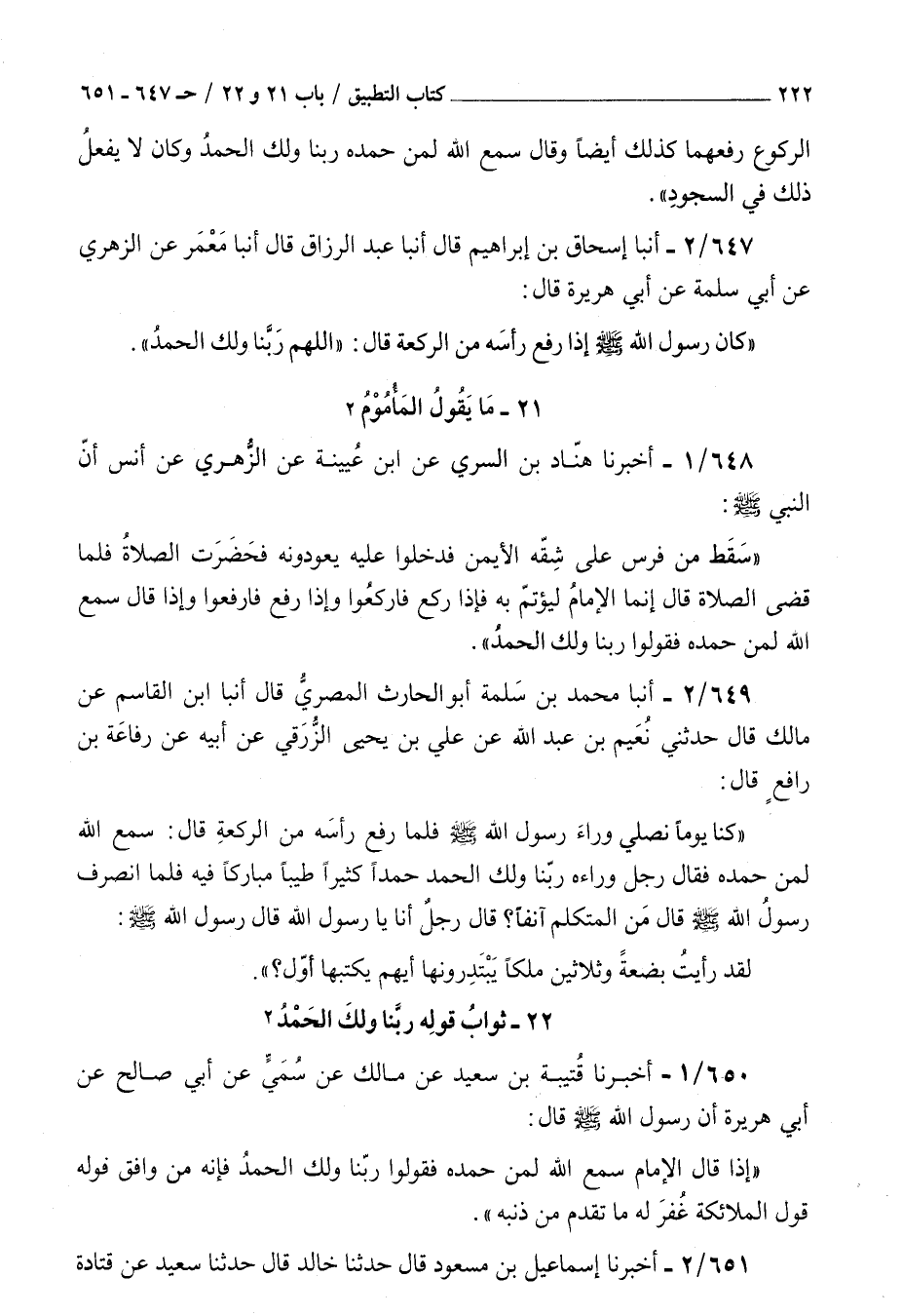 649 - أنبأ محمد بن سلمة أبو الحارث المصري قال أنبأ بن القاسم عن مالك قال حدثني نعيم بن عبد الله عن علي بن يحيى الزرقي عن أبيه عن رفاعة بن رافع قال : كنا يوما نصلي وراء رسول الله صلى الله عليه و سلم فلما رفع رأسه من الركعة قال سمع الله لمن حمده فقال رجل وراءه ربنا ولك الحمد حمدا كثيرا طيبا مباركا فيه فلما انصرف رسول الله صلى الله عليه و سلم قال من المتكلم آنفا قال رجل أنا يا رسول الله قال رسول الله صلى الله عليه و سلم لقد رأيت بضعة وثلاثين ملكا يبتدرونها أيهم يكتبها أول