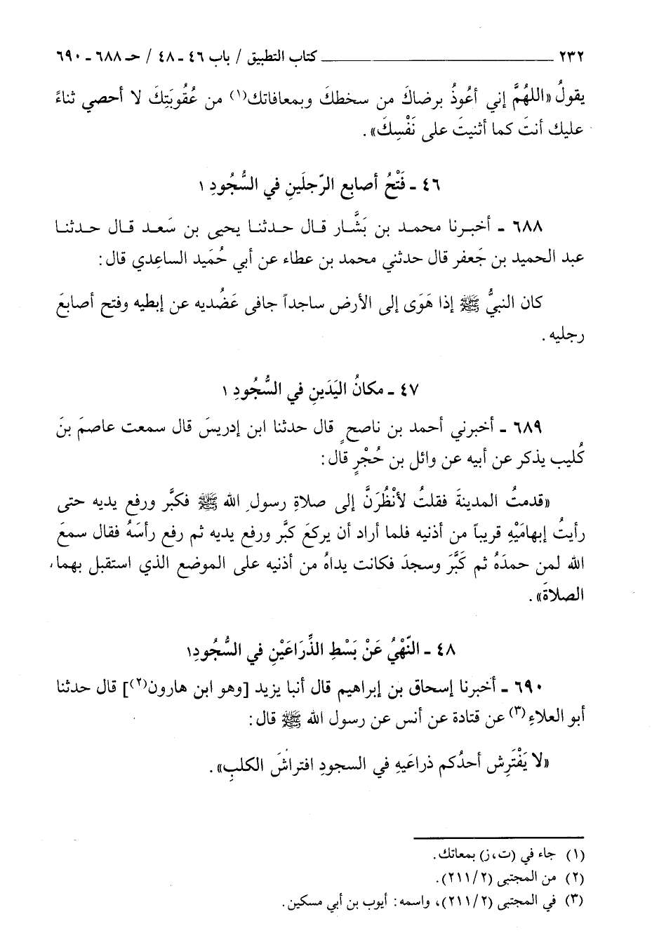 688 - أخبرنا محمد بن بشار قال حدثنا يحيى بن سعد قال حدثنا عبد الحميد بن جعفر قال حدثني محمد بن عطاء عن أبي حميد الساعدي قال : كان النبي صلى الله عليه و سلم إذا هوى إلى الأرض ساجدا جافى عضديه عن أبطيه وفتح أصابع رجليه