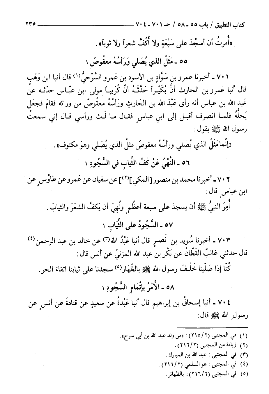 701 - أخبرنا عمرو بن سواد بن الأسود بن عمرو السرحي قال أنبأ بن وهب قال أنبأ عمرو بن الحارث أن بكيرا حدثه أن كريبا مولى بن عباس حدثه عن عبد الله بن عباس : أنه رأى عبد الله بن الحارث ورأسه معقوص من ورائه فقام فجعل يحله فلما انصرف أقبل إلى بن عباس فقال ما لك ورأسي قال إني سمعت رسول الله صلى الله عليه و سلم يقول إنما مثل الذي يصلي ورأسه معقوص مثل الذي يصلي وهو مكتوف