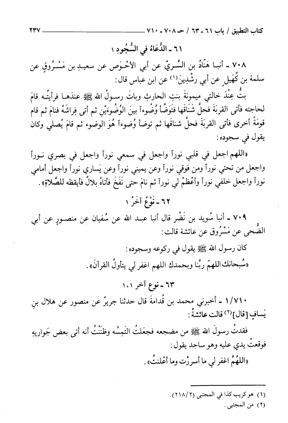 708 - أنبأ هناد بن السري عن أبي الأحوص عن سعيد بن مسروق عن سلمة بن كهيل عن أبي رشدين عن بن عباس قال : بت عند خالتي ميمونة بنت الحارث وبات رسول الله صلى الله عليه و سلم عندها فرأيته قام لحاجته فأتى القربة فحل شناقها فتوضأ وضوءا بين الوضوءين ثم أتى فراشه فنام ثم قام قومة أخرى فأتى القربة فحل شناقها ثم توضأ وضوءا هو الوضوء ثم قام يصلي وكان يقول في سجوده اللهم اجعل في قلبي نورا واجعل في سمعي نورا واجعل في بصري نورا واجعل من تحتي نورا ومن فوقي نورا وعن يميني نورا وعن يساري نورا واجعل أمامي نورا واجعل خلفي نورا وأعظم لي نورا ثم نام حتى نفخ فأتاه بلال فأيقظه للصلاة